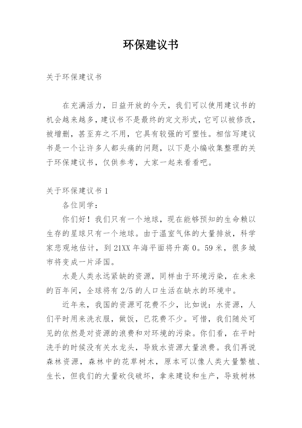 环保建议书关于环保建议书在充满活力,日益开放的今天,我们可以使用建议书的机会越来越多,建议书不是最终的定文形式,它可以被修改,被增删,甚至弃之不用,它具有较强的可塑性。相信写建议书是一个让许多人都头痛的问题,以下是小编收集整理的关于环保建议书,仅供参考,大家一起来看看吧。关于环保建议书1各位同学:你们好!我们只有一个地球,现在能够预知的生命赖以生存的星球只有一个地球。由于温室气体的大量排放,科学家悲观地估计,到21XX年海平面将升高0。59米,很多城市将变成一片泽国。水是人类永远紧缺的资源,同样由于环境污