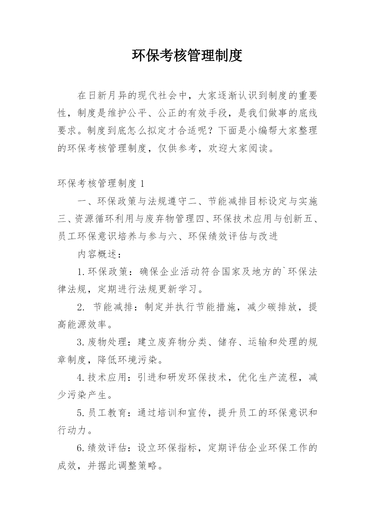 环保考核管理制度在日新月异的现代社会中,大家逐渐认识到制度的重要性,制度是维护公平、公正的有效手段,是我们做事的底线要求。制度到底怎么拟定才合适呢?下面是小编帮大家整理的环保考核管理制度,仅供参考,欢迎大家阅读。环保考核管理制度1一、环保政策与法规遵守二、节能减排目标设定与实施三、资源循环利用与废弃物管理四、环保技术应用与创新五、员工环保意识培养与参与六、环保绩效评估与改进内容概述:1.环保政策:确保企业活动符合国家及地方的`环保法律法规,定期进行法规更新学习。2.节能减排:制定并执行节能措施,减少碳排放