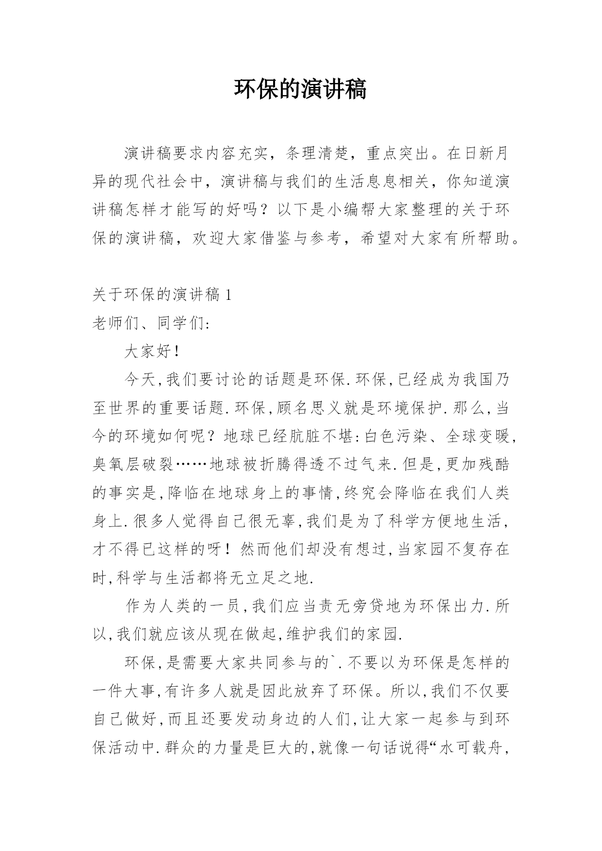 环保的演讲稿演讲稿要求内容充实,条理清楚,重点突出。在日新月异的现代社会中,演讲稿与我们的生活息息相关,你知道演讲稿怎样才能写的好吗?以下是小编帮大家整理的关于环保的演讲稿,欢迎大家借鉴与参考,希望对大家有所帮助。关于环保的演讲稿1老师们、同学们:大家好!今天,我们要讨论的话题是环保.环保,已经成为我国乃至世界的重要话题.环保,顾名思义就是环境保护.那么,当今的环境如何呢?地球已经肮脏不堪:白色污染、全球变暖,臭氧层破裂……地球被折腾得透不过气来.但是,更加残酷的事实是,降临在地球身上的事情,终究会降临在