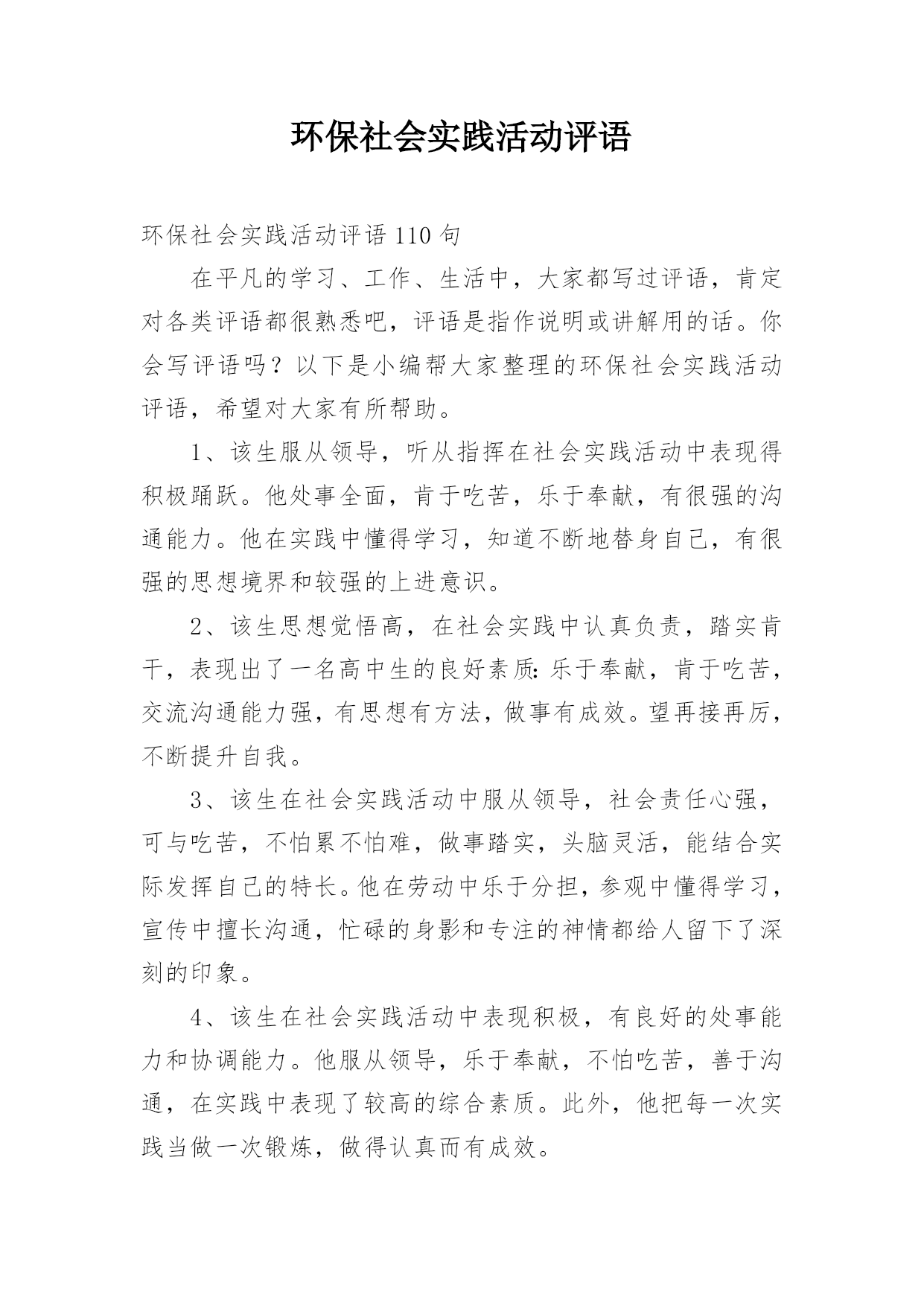 环保社会实践活动评语环保社会实践活动评语110句在平凡的学习、工作、生活中,大家都写过评语,肯定对各类评语都很熟悉吧,评语是指作说明或讲解用的话。你会写评语吗?以下是小编帮大家整理的环保社会实践活动评语,希望对大家有所帮助。1、该生服从领导,听从指挥在社会实践活动中表现得积极踊跃。他处事全面,肯于吃苦,乐于奉献,有很强的沟通能力。他在实践中懂得学习,知道不断地替身自己,有很强的思想境界和较强的上进意识。2、该生思想觉悟高,在社会实践中认真负责,踏实肯干,表现出了一名高中生的良好素质:乐于奉献,肯于吃苦,交