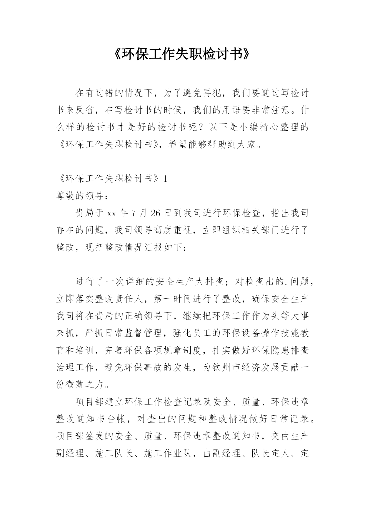 《环保工作失职检讨书》在有过错的情况下,为了避免再犯,我们要通过写检讨书来反省,在写检讨书的时候,我们的用语要非常注意。什么样的检讨书才是好的检讨书呢?以下是小编精心整理的《环保工作失职检讨书》,希望能够帮助到大家。《环保工作失职检讨书》1尊敬的领导:贵局于xx年7月26日到我司进行环保检查,指出我司存在的问题,我司领导高度重视,立即组织相关部门进行了整改,现把整改情况汇报如下:进行了一次详细的安全生产大排查;对检查出的.问题,立即落实整改责任人,第一时间进行了整改,确保安全生产我司将在贵局的正确领导下,