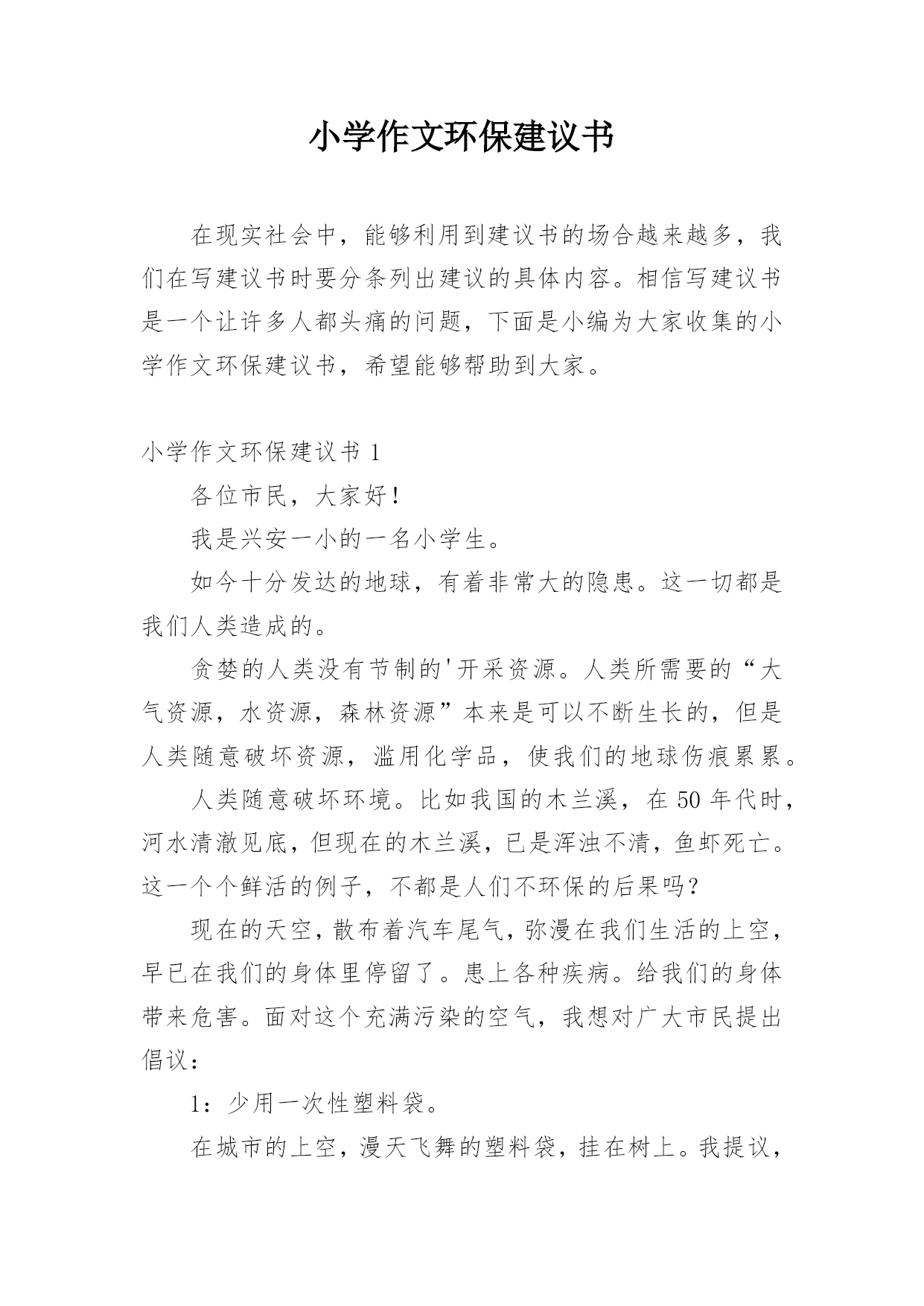 小学作文环保建议书在现实社会中,能够利用到建议书的场合越来越多,我们在写建议书时要分条列出建议的具体内容。相信写建议书是一个让许多人都头痛的问题,下面是小编为大家收集的小学作文环保建议书,希望能够帮助到大家。小学作文环保建议书1各位市民,大家好!我是兴安一小的一名小学生。如今十分发达的地球,有着非常大的隐患。这一切都是我们人类造成的。贪婪的人类没有节制的'开采资源。人类所需要的“大气资源,水资源,森林资源”本来是可以不断生长的,但是人类随意破坏资源,滥用化学品,使我们的地球伤痕累累。人类随意破坏环境。比如