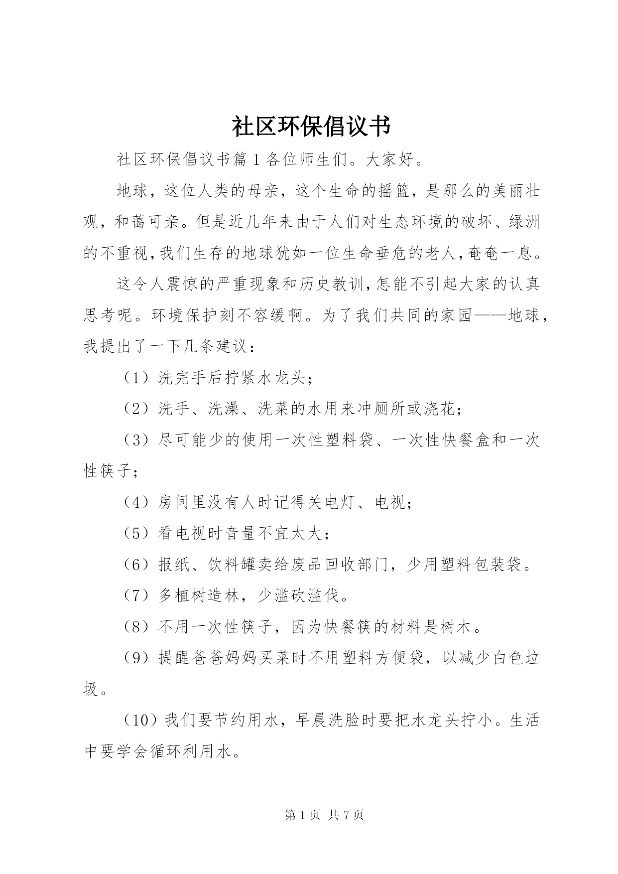 第PAGE\*Arabic\*MERGEFORMAT7页共NUMPAGES\*MERGEFORMAT7页社区环保倡议书社区环保倡议书篇1各位师生们。大家好。地球,这位人类的母亲,这个生命的摇篮,是那么的美丽壮观,和蔼可亲。但是近几年来由于人们对生态环境的破坏、绿洲的不重视,我们生存的地球犹如一位生命垂危的老人,奄奄一息。这令人震惊的严重现象和历史教训,怎能不引起大家的认真思考呢。环境保护刻不容缓啊。为了我们共同的家园——地球,我提出了一下几条建议:(1)洗完手后拧紧水龙头;(2)洗手、洗澡、洗