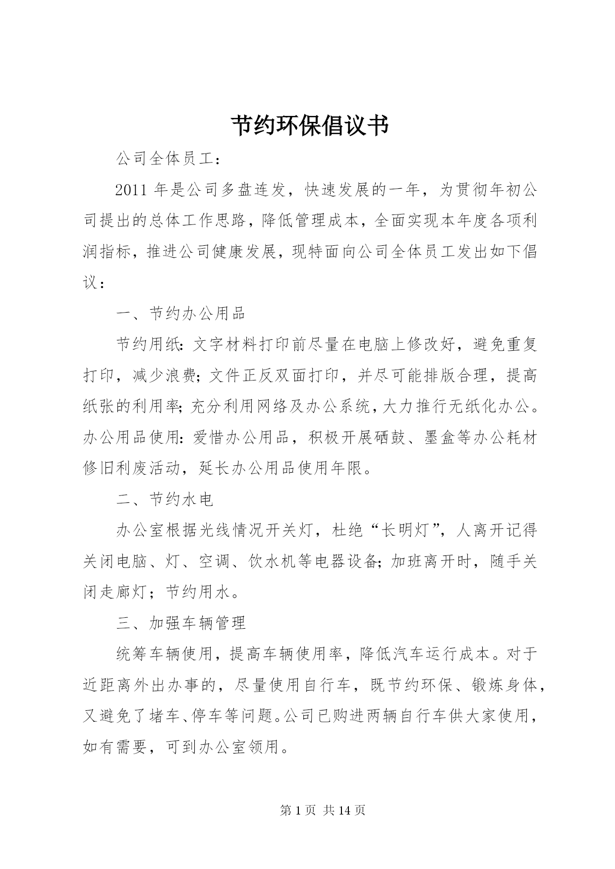 第PAGE\*Arabic\*MERGEFORMAT14页共NUMPAGES\*MERGEFORMAT14页节约环保倡议书公司全体员工:2011年是公司多盘连发,快速发展的一年,为贯彻年初公司提出的总体工作思路,降低管理成本,全面实现本年度各项利润指标,推进公司健康发展,现特面向公司全体员工发出如下倡议:一、节约办公用品节约用纸:文字材料打印前尽量在电脑上修改好,避免重复打印,减少浪费;文件正反双面打印,并尽可能排版合理,提高纸张的利用率;充分利用网络及办公系统,大力推行无纸化办公。办公用品使