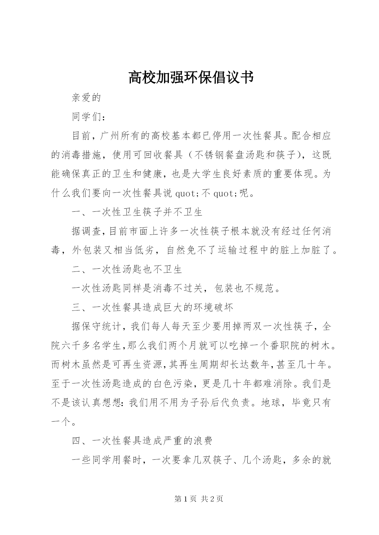 第PAGE\*Arabic\*MERGEFORMAT2页共NUMPAGES\*MERGEFORMAT2页高校加强环保倡议书亲爱的同学们:目前,广州所有的高校基本都已停用一次性餐具。配合相应的消毒措施,使用可回收餐具(不锈钢餐盘汤匙和筷子),这既能确保真正的卫生和健康,也是大学生良好素质的重要体现。为什么我们要向一次性餐具说quot;不quot;呢。一、一次性卫生筷子并不卫生据调查,目前市面上许多一次性筷子根本就没有经过任何消毒,外包装又相当低劣,自然免不了运输过程中的脏上加脏了。二、一次性汤匙