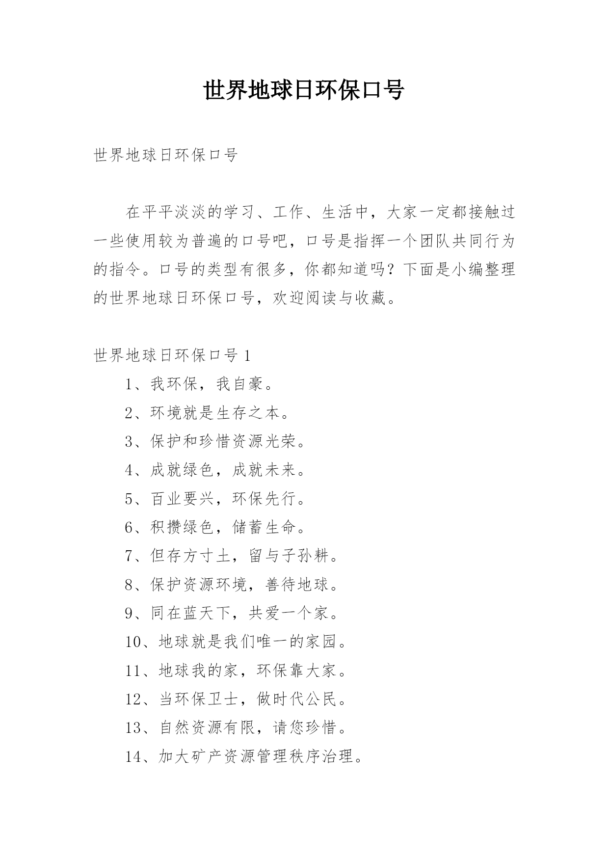 世界地球日环保口号世界地球日环保口号在平平淡淡的学习、工作、生活中,大家一定都接触过一些使用较为普遍的口号吧,口号是指挥一个团队共同行为的指令。口号的类型有很多,你都知道吗?下面是小编整理的世界地球日环保口号,欢迎阅读与收藏。世界地球日环保口号11、我环保,我自豪。2、环境就是生存之本。3、保护和珍惜资源光荣。4、成就绿色,成就未来。5、百业要兴,环保先行。6、积攒绿色,储蓄生命。7、但存方寸土,留与子孙耕。8、保护资源环境,善待地球。9、同在蓝天下,共爱一个家。10、地球就是我们唯一的家园。11、地球我