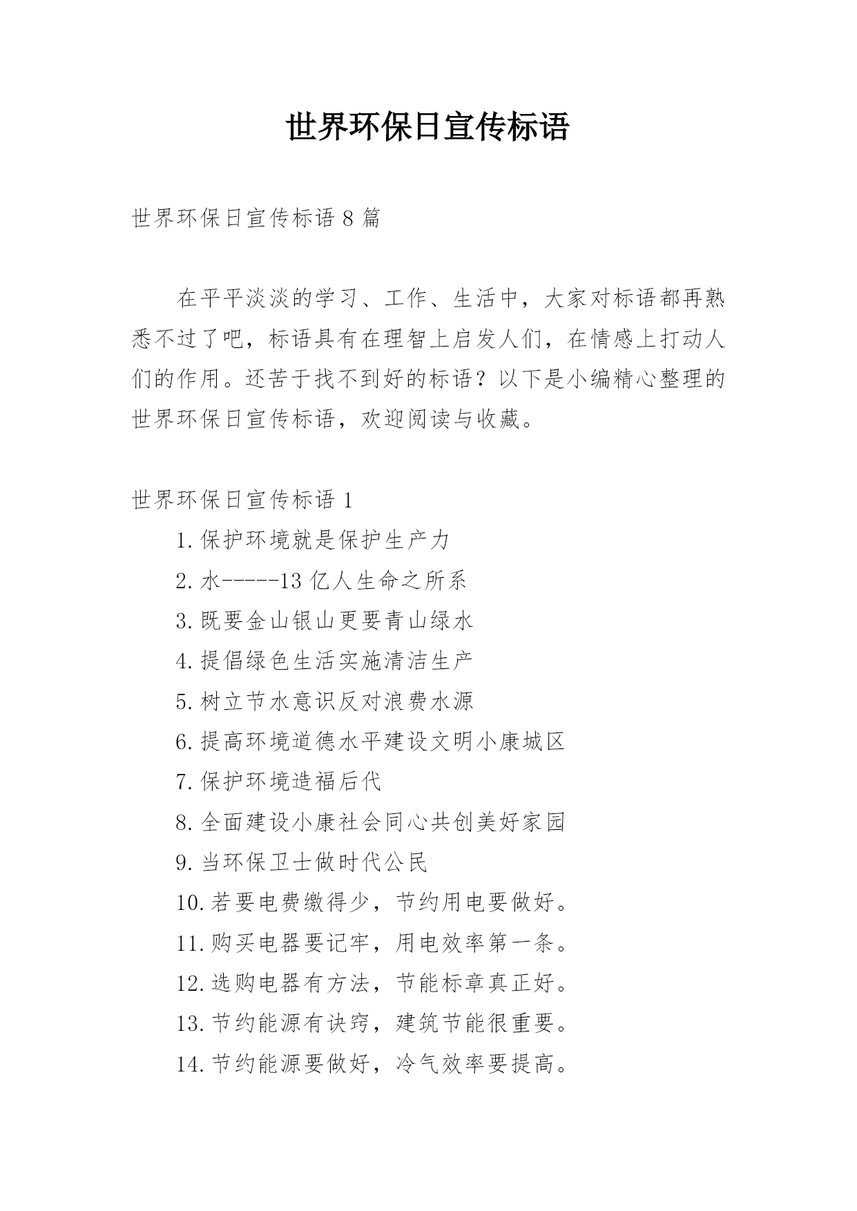 世界环保日宣传标语世界环保日宣传标语8篇在平平淡淡的学习、工作、生活中,大家对标语都再熟悉不过了吧,标语具有在理智上启发人们,在情感上打动人们的作用。还苦于找不到好的标语?以下是小编精心整理的世界环保日宣传标语,欢迎阅读与收藏。世界环保日宣传标语11.保护环境就是保护生产力2.水-----13亿人生命之所系3.既要金山银山更要青山绿水4.提倡绿色生活实施清洁生产5.树立节水意识反对浪费水源6.提高环境道德水平建设文明小康城区7.保护环境造福后代8.全面建设小康社会同心共创美好家园9.当环保卫士做时代公民1