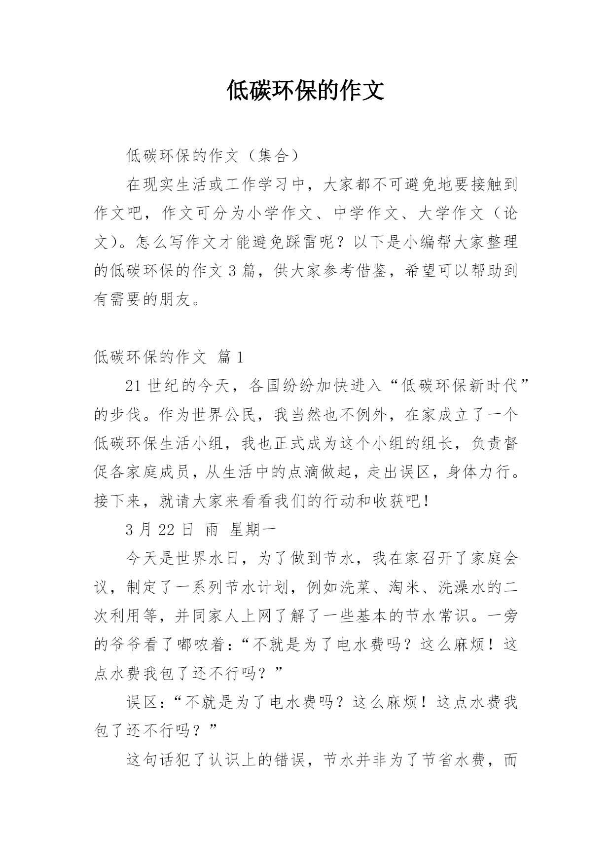 低碳环保的作文低碳环保的作文(集合)在现实生活或工作学习中,大家都不可避免地要接触到作文吧,作文可分为小学作文、中学作文、大学作文(论文)。怎么写作文才能避免踩雷呢?以下是小编帮大家整理的低碳环保的作文3篇,供大家参考借鉴,希望可以帮助到有需要的朋友。低碳环保的作文篇121世纪的今天,各国纷纷加快进入“低碳环保新时代”的步伐。作为世界公民,我当然也不例外,在家成立了一个低碳环保生活小组,我也正式成为这个小组的组长,负责督促各家庭成员,从生活中的点滴做起,走出误区,身体力行。接下来,就请大家来看看我们的行动