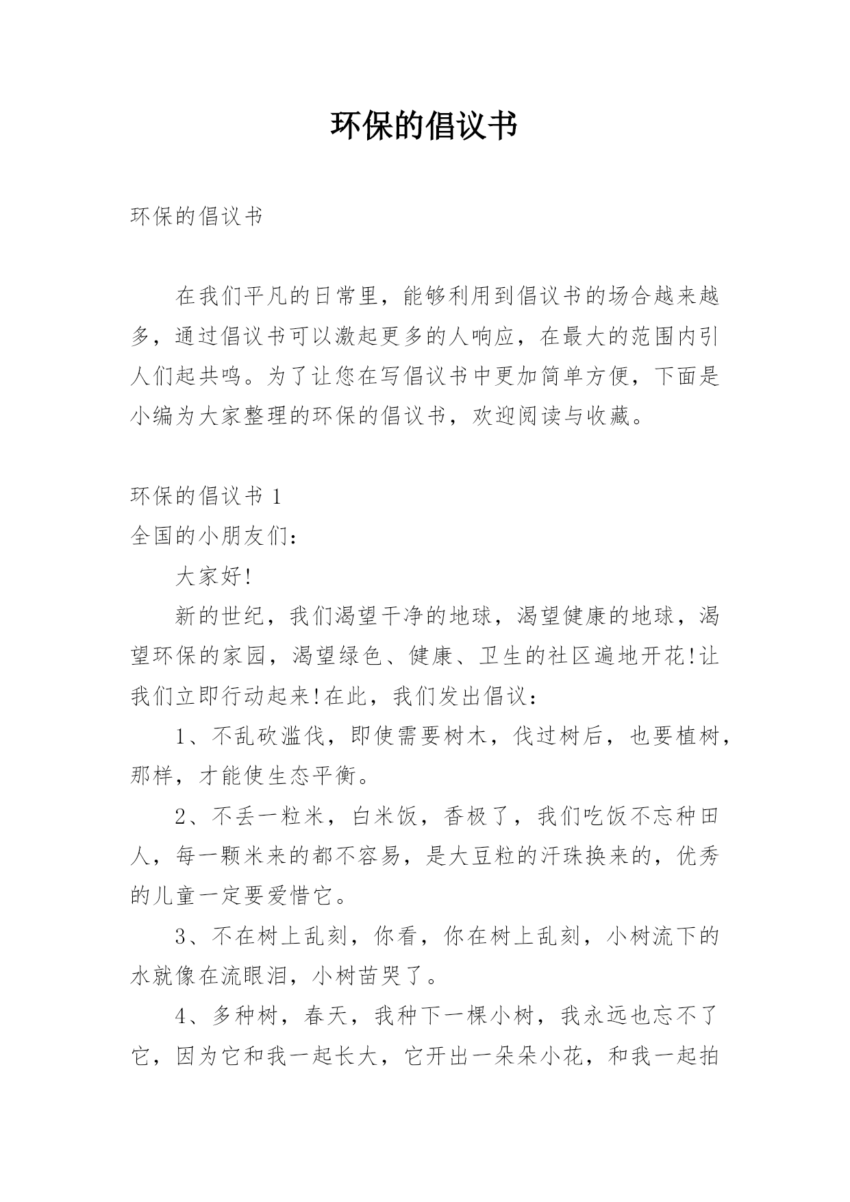 环保的倡议书环保的倡议书在我们平凡的日常里,能够利用到倡议书的场合越来越多,通过倡议书可以激起更多的人响应,在最大的范围内引人们起共鸣。为了让您在写倡议书中更加简单方便,下面是小编为大家整理的环保的倡议书,欢迎阅读与收藏。环保的倡议书1全国的小朋友们:大家好!新的世纪,我们渴望干净的地球,渴望健康的地球,渴望环保的家园,渴望绿色、健康、卫生的社区遍地开花!让我们立即行动起来!在此,我们发出倡议:1、不乱砍滥伐,即使需要树木,伐过树后,也要植树,那样,才能使生态平衡。2、不丢一粒米,白米饭,香极了,我们吃饭