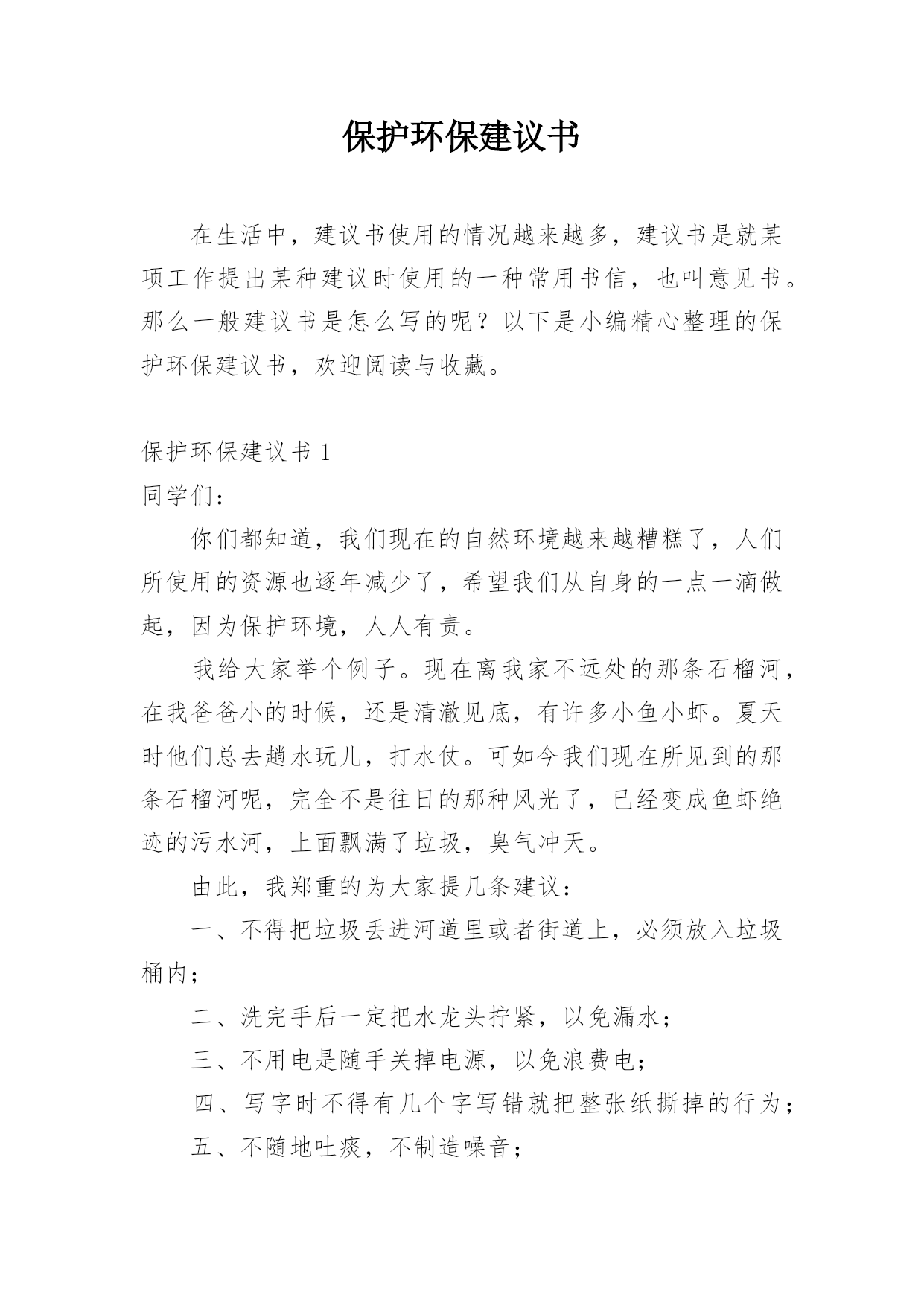 保护环保建议书在生活中,建议书使用的情况越来越多,建议书是就某项工作提出某种建议时使用的一种常用书信,也叫意见书。那么一般建议书是怎么写的呢?以下是小编精心整理的保护环保建议书,欢迎阅读与收藏。保护环保建议书1同学们:你们都知道,我们现在的自然环境越来越糟糕了,人们所使用的资源也逐年减少了,希望我们从自身的一点一滴做起,因为保护环境,人人有责。我给大家举个例子。现在离我家不远处的那条石榴河,在我爸爸小的时候,还是清澈见底,有许多小鱼小虾。夏天时他们总去趟水玩儿,打水仗。可如今我们现在所见到的那条石榴河呢,