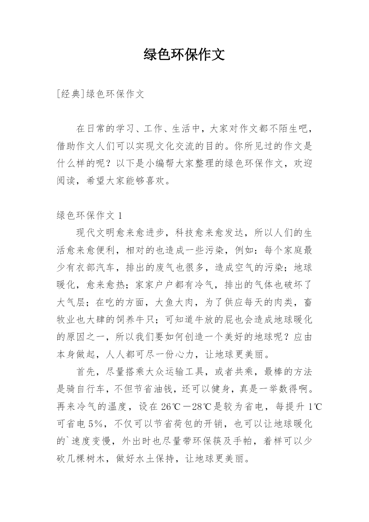 绿色环保作文[经典]绿色环保作文在日常的学习、工作、生活中,大家对作文都不陌生吧,借助作文人们可以实现文化交流的目的。你所见过的作文是什么样的呢?以下是小编帮大家整理的绿色环保作文,欢迎阅读,希望大家能够喜欢。绿色环保作文1现代文明愈来愈进步,科技愈来愈发达,所以人们的生活愈来愈便利,相对的也造成一些污染,例如:每个家庭最少有衣部汽车,排出的废气也很多,造成空气的污染;地球暖化,愈来愈热;家家户户都有冷气,排出的气体也破坏了大气层;在吃的方面,大鱼大肉,为了供应每天的肉类,畜牧业也大肆的饲养牛只;可知道牛