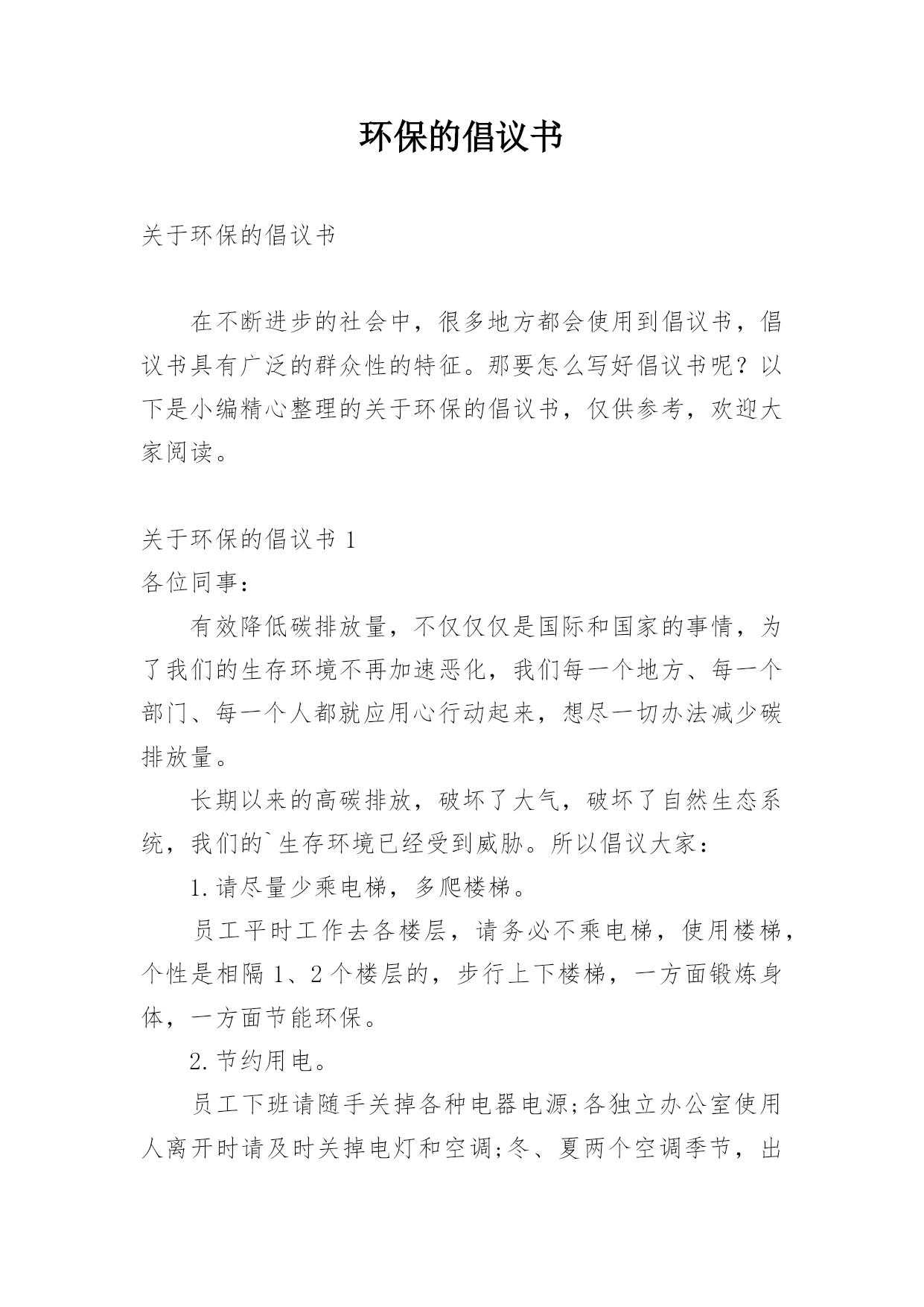 环保的倡议书关于环保的倡议书在不断进步的社会中,很多地方都会使用到倡议书,倡议书具有广泛的群众性的特征。那要怎么写好倡议书呢?以下是小编精心整理的关于环保的倡议书,仅供参考,欢迎大家阅读。关于环保的倡议书1各位同事:有效降低碳排放量,不仅仅仅是国际和国家的事情,为了我们的生存环境不再加速恶化,我们每一个地方、每一个部门、每一个人都就应用心行动起来,想尽一切办法减少碳排放量。长期以来的高碳排放,破坏了大气,破坏了自然生态系统,我们的`生存环境已经受到威胁。所以倡议大家:1.请尽量少乘电梯,多爬楼梯。员工平时