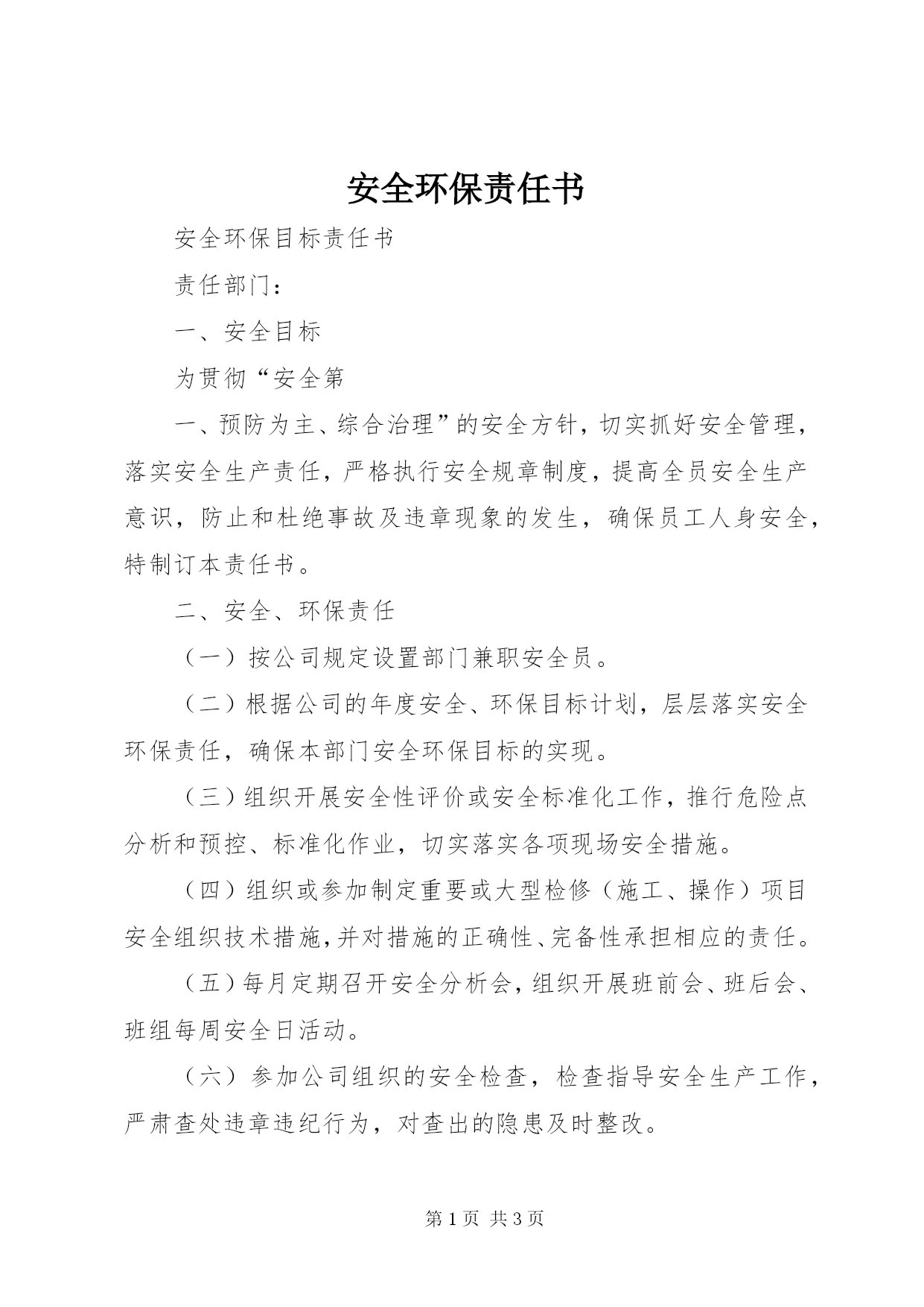 第PAGE\*Arabic\*MERGEFORMAT3页共NUMPAGES\*MERGEFORMAT3页安全环保责任书安全环保目标责任书责任部门:一、安全目标为贯彻“安全第一、预防为主、综合治理”的安全方针,切实抓好安全管理,落实安全生产责任,严格执行安全规章制度,提高全员安全生产意识,防止和杜绝事故及违章现象的发生,确保员工人身安全,特制订本责任书。二、安全、环保责任(一)按公司规定设置部门兼职安全员。(二)根据公司的年度安全、环保目标计划,层层落实安全环保责任,确保本部门安全环保目标的实现