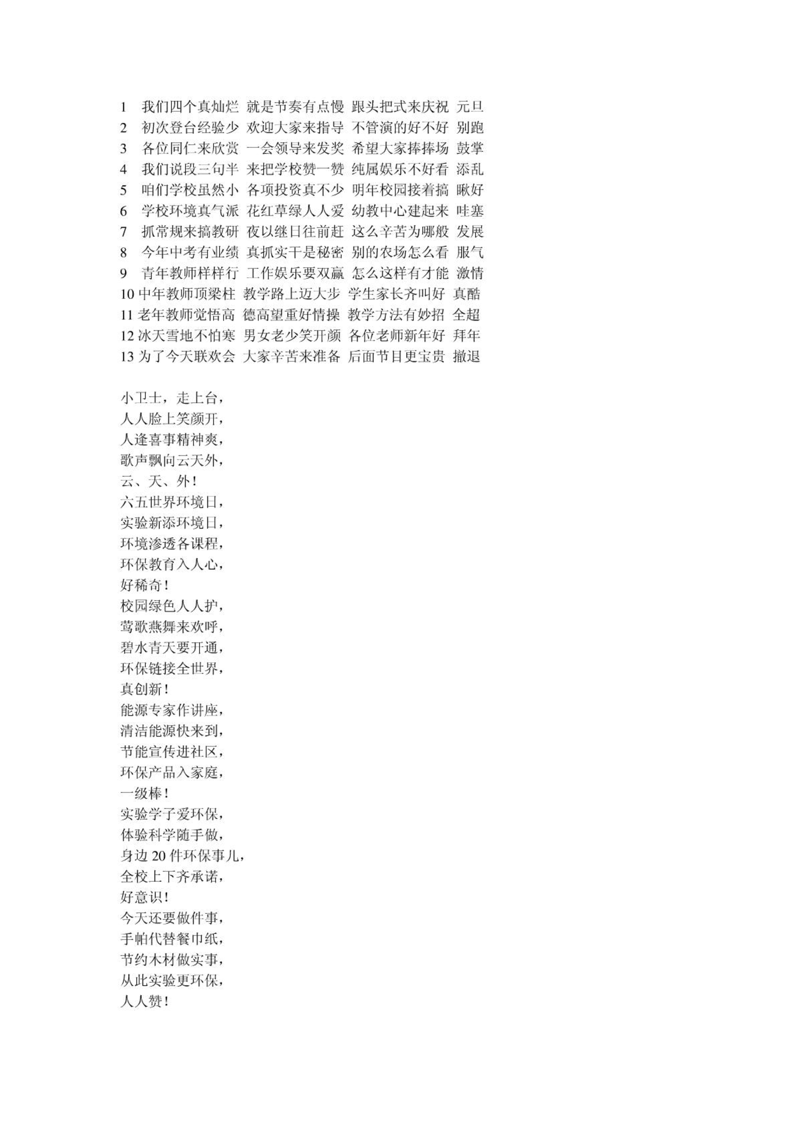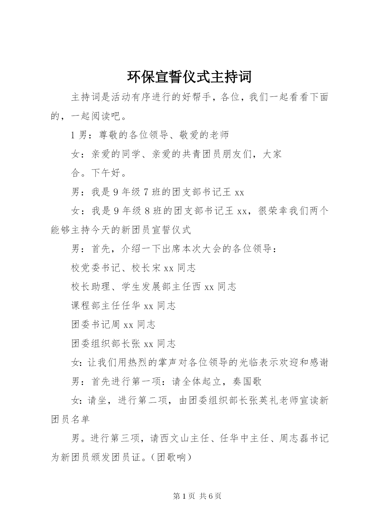第PAGE\*Arabic\*MERGEFORMAT6页共NUMPAGES\*MERGEFORMAT6页环保宣誓仪式主持词主持词是活动有序进行的好帮手,各位,我们一起看看下面的,一起阅读吧。1男:尊敬的各位领导、敬爱的老师女:亲爱的同学、亲爱的共青团员朋友们,大家合。下午好。男:我是9年级7班的团支部书记王xx女:我是9年级8班的团支部书记王xx,很荣幸我们两个能够主持今天的新团员宣誓仪式男:首先,介绍一下出席本次大会的各位领导:校党委书记、校长宋xx同志校长助理、学生发展部主任西xx同志课程