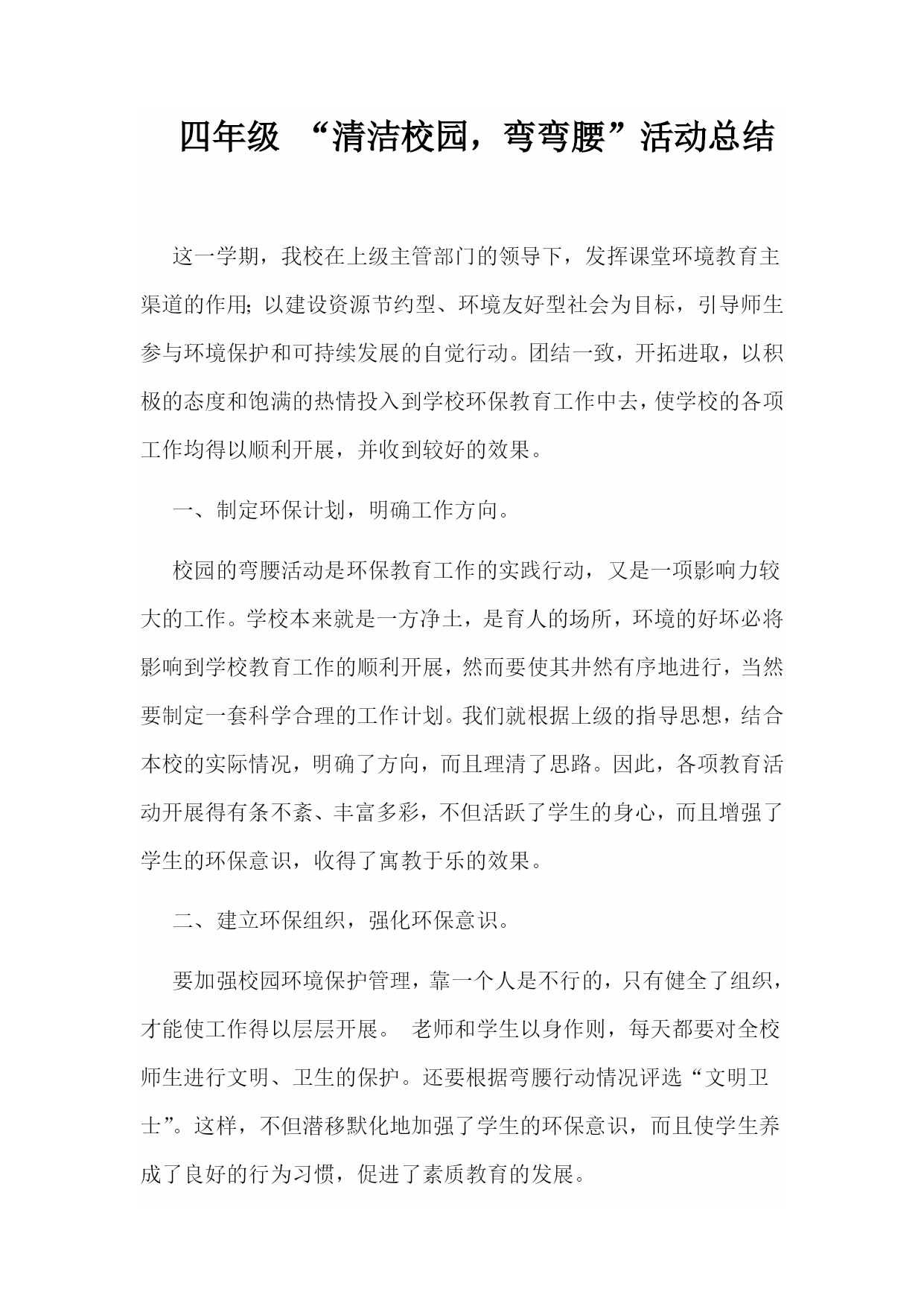 四年级“清洁校园,弯弯腰”活动总结这一学期,我校在上级主管部门的领导下,发挥课堂环境教育主渠道的作用;以建设资源节约型、环境友好型社会为目标,引导师生参与环境保护和可持续发展的自觉行动。团结一致,开拓进取,以积极的态度和饱满的热情投入到学校环保教育工作中去,使学校的各项工作均得以顺利开展,并收到较好的效果。一、制定环保计划,明确工作方向。校园的弯腰活动是环保教育工作的实践行动,又是一项影响力较大的工作。学校本来就是一方净土,是育人的场所,环境的好坏必将影响到学校教育工作的顺利开展,然而要使其井然有序地进行