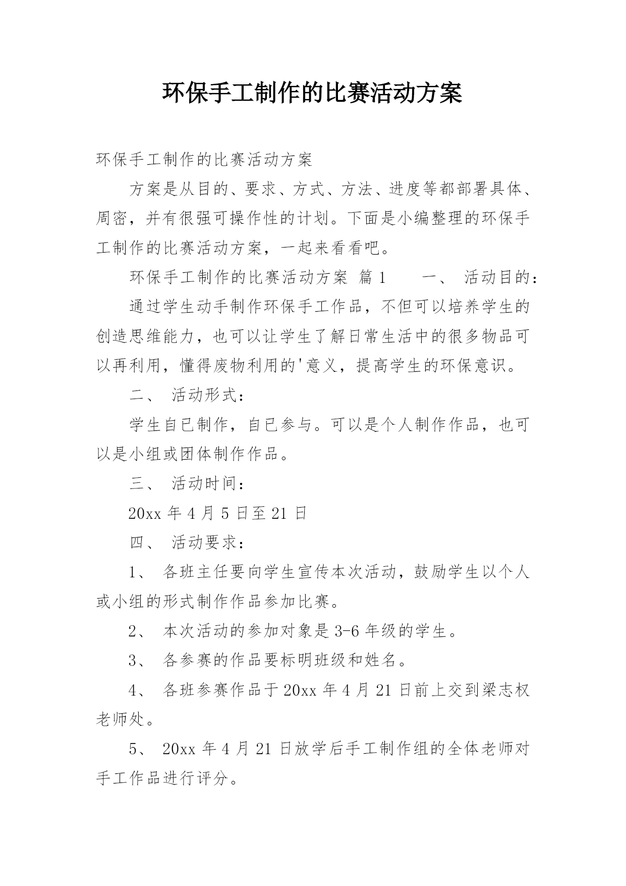 环保手工制作的比赛活动方案环保手工制作的比赛活动方案方案是从目的、要求、方式、方法、进度等都部署具体、周密,并有很强可操作性的计划。下面是小编整理的环保手工制作的比赛活动方案,一起来看看吧。环保手工制作的比赛活动方案篇1一、活动目的:通过学生动手制作环保手工作品,不但可以培养学生的创造思维能力,也可以让学生了解日常生活中的很多物品可以再利用,懂得废物利用的'意义,提高学生的环保意识。二、活动形式:学生自已制作,自已参与。可以是个人制作作品,也可以是小组或团体制作作品。三、活动时间:20xx年4月5日至21