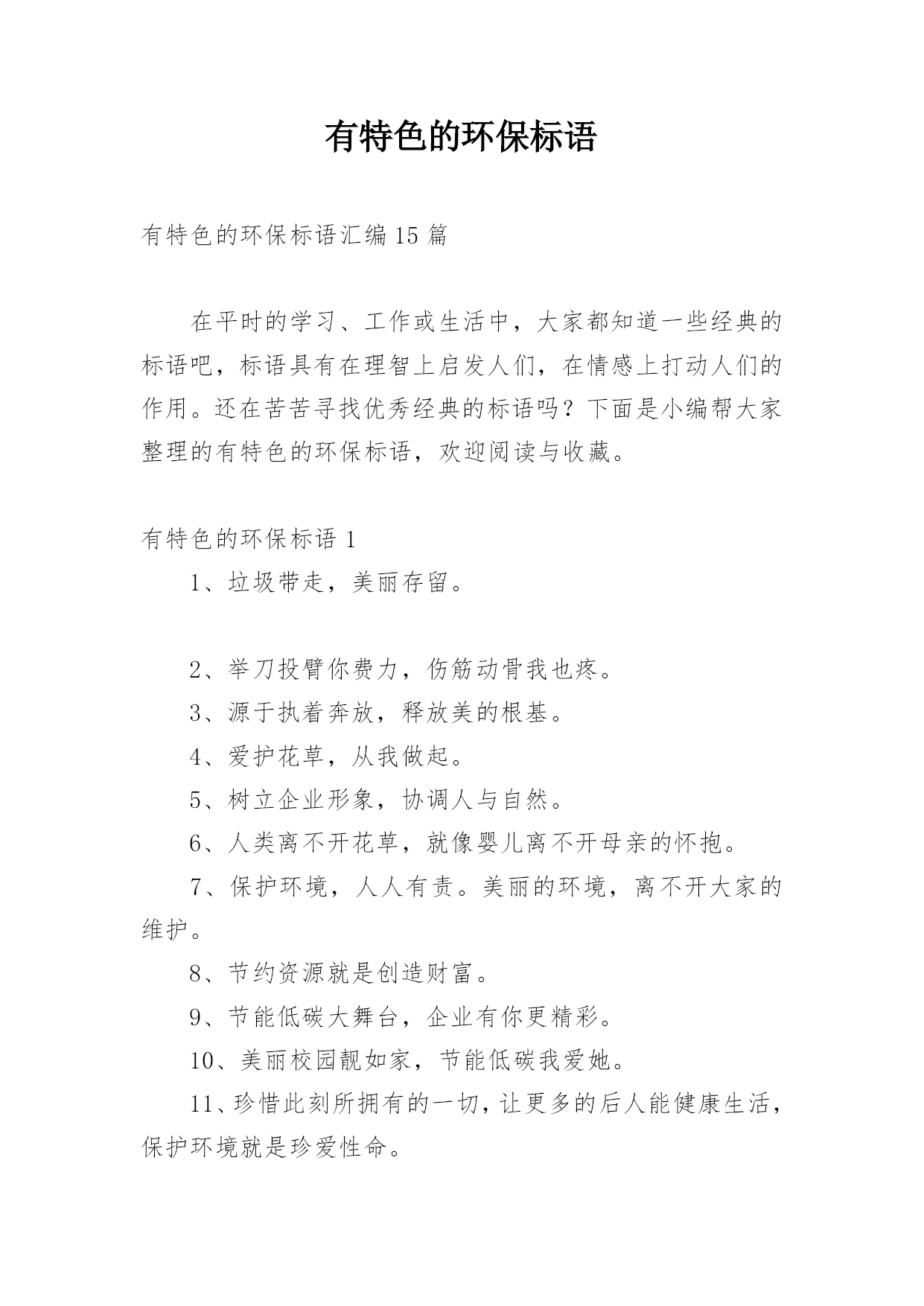 有特色的环保标语有特色的环保标语汇编15篇在平时的学习、工作或生活中,大家都知道一些经典的标语吧,标语具有在理智上启发人们,在情感上打动人们的作用。还在苦苦寻找优秀经典的标语吗?下面是小编帮大家整理的有特色的环保标语,欢迎阅读与收藏。有特色的环保标语11、垃圾带走,美丽存留。2、举刀投臂你费力,伤筋动骨我也疼。3、源于执着奔放,释放美的根基。4、爱护花草,从我做起。5、树立企业形象,协调人与自然。6、人类离不开花草,就像婴儿离不开母亲的怀抱。7、保护环境,人人有责。美丽的环境,离不开大家的维护。8、节约资