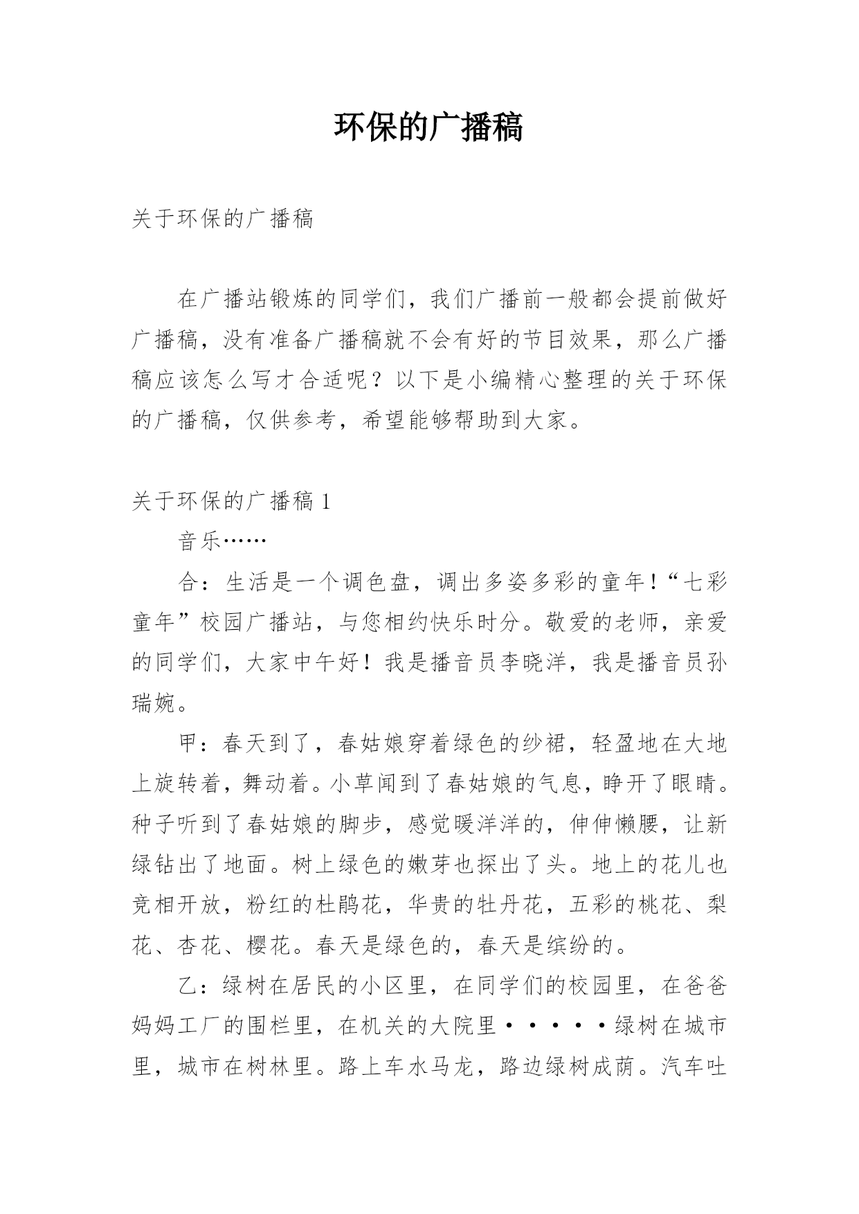 环保的广播稿关于环保的广播稿在广播站锻炼的同学们,我们广播前一般都会提前做好广播稿,没有准备广播稿就不会有好的节目效果,那么广播稿应该怎么写才合适呢?以下是小编精心整理的关于环保的广播稿,仅供参考,希望能够帮助到大家。关于环保的广播稿1音乐……合:生活是一个调色盘,调出多姿多彩的童年!“七彩童年”校园广播站,与您相约快乐时分。敬爱的老师,亲爱的同学们,大家中午好!我是播音员李晓洋,我是播音员孙瑞婉。甲:春天到了,春姑娘穿着绿色的纱裙,轻盈地在大地上旋转着,舞动着。小草闻到了春姑娘的气息,睁开了眼睛。种子听