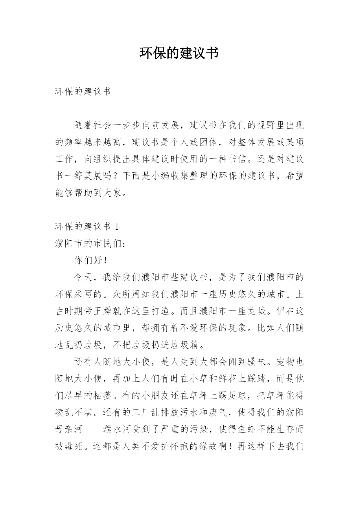 环保的建议书环保的建议书随着社会一步步向前发展,建议书在我们的视野里出现的频率越来越高,建议书是个人或团体,对整体发展或某项工作,向组织提出具体建议时使用的一种书信。还是对建议书一筹莫展吗?下面是小编收集整理的环保的建议书,希望能够帮助到大家。环保的建议书1濮阳市的市民们:你们好!今天,我给我们濮阳市些建议书,是为了我们濮阳市的环保采写的。众所周知我们濮阳市一座历史悠久的城市。上古时期帝王舜就在这里打渔。而且濮阳市一座龙城。但在这历史悠久的城市里,却拥有着不爱环保的现象。比如人们随地乱扔垃圾,不把垃圾扔进