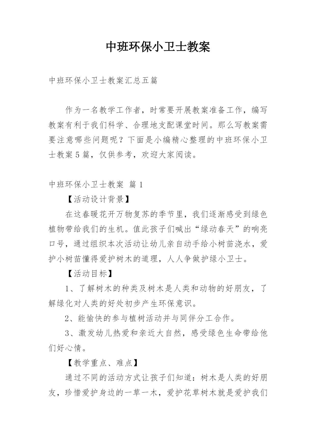 中班环保小卫士教案中班环保小卫士教案汇总五篇作为一名教学工作者,时常要开展教案准备工作,编写教案有利于我们科学、合理地支配课堂时间。那么写教案需要注意哪些问题呢?下面是小编精心整理的中班环保小卫士教案5篇,仅供参考,欢迎大家阅读。中班环保小卫士教案篇1【活动设计背景】在这春暖花开万物复苏的季节里,我们逐渐感受到绿色植物带给我们的生机。值此孩子们喊出“绿动春天”的响亮口号,通过组织本次活动让幼儿亲自动手给小树苗浇水,爱护小树苗懂得爱护树木的道理,人人争做护绿小卫士。【活动目标】1、了解树木的种类及树木是人类