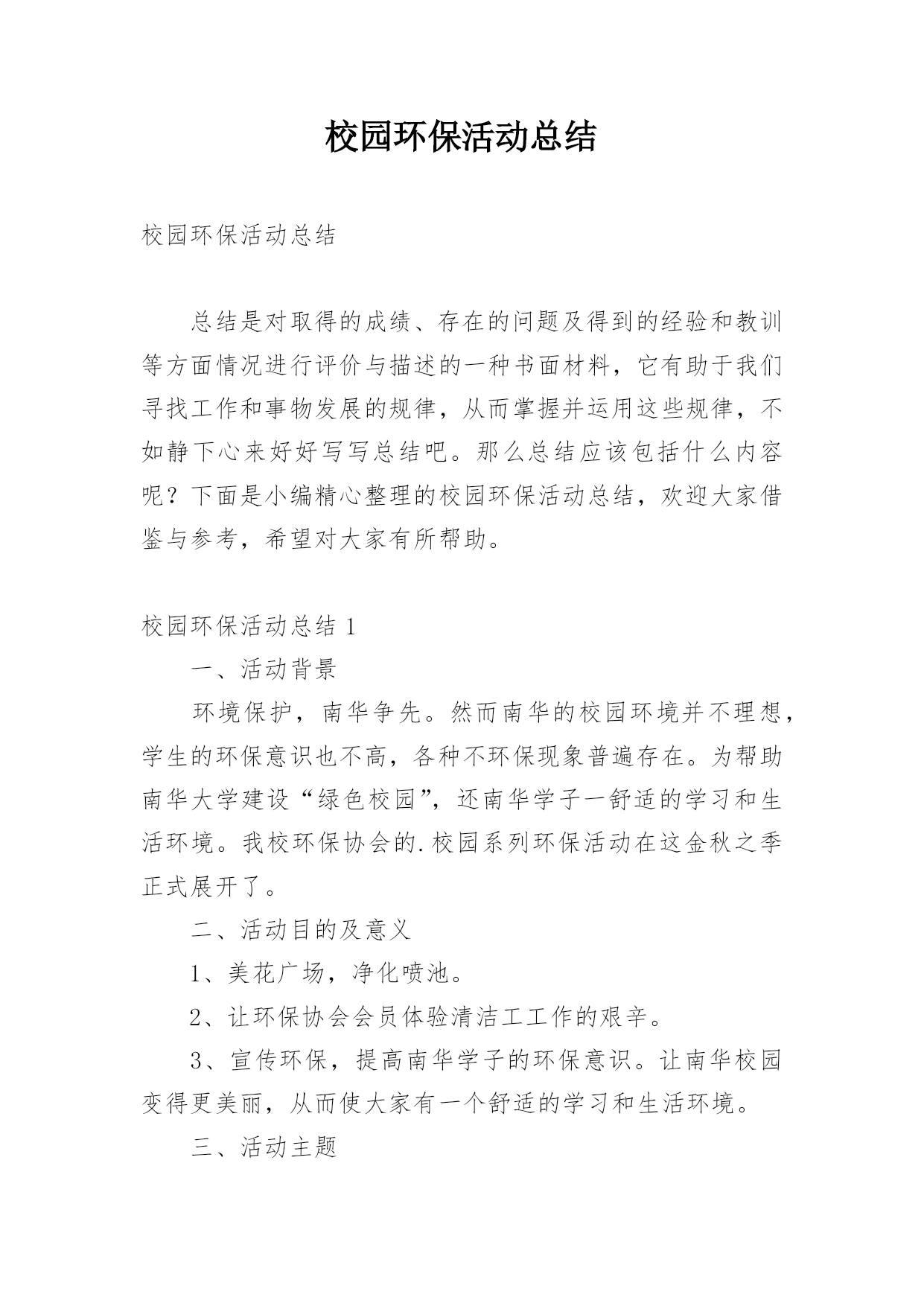 校园环保活动总结校园环保活动总结总结是对取得的成绩、存在的问题及得到的经验和教训等方面情况进行评价与描述的一种书面材料,它有助于我们寻找工作和事物发展的规律,从而掌握并运用这些规律,不如静下心来好好写写总结吧。那么总结应该包括什么内容呢?下面是小编精心整理的校园环保活动总结,欢迎大家借鉴与参考,希望对大家有所帮助。校园环保活动总结1一、活动背景环境保护,南华争先。然而南华的校园环境并不理想,学生的环保意识也不高,各种不环保现象普遍存在。为帮助南华大学建设“绿色校园”,还南华学子一舒适的学习和生活环境。我校