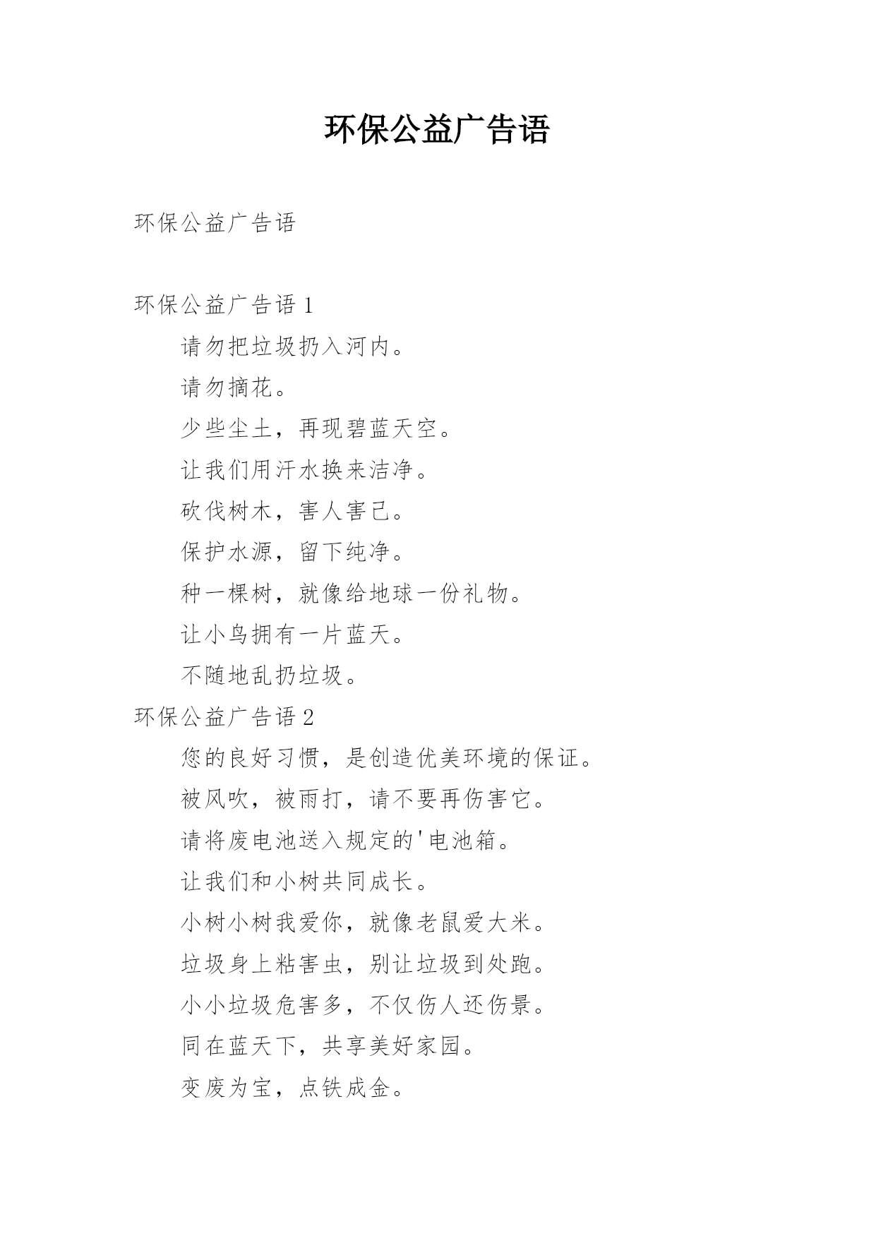 环保公益广告语环保公益广告语环保公益广告语1请勿把垃圾扔入河内。请勿摘花。少些尘土,再现碧蓝天空。让我们用汗水换来洁净。砍伐树木,害人害己。保护水源,留下纯净。种一棵树,就像给地球一份礼物。让小鸟拥有一片蓝天。不随地乱扔垃圾。环保公益广告语2您的良好习惯,是创造优美环境的保证。被风吹,被雨打,请不要再伤害它。请将废电池送入规定的'电池箱。让我们和小树共同成长。小树小树我爱你,就像老鼠爱大米。垃圾身上粘害虫,别让垃圾到处跑。小小垃圾危害多,不仅伤人还伤景。同在蓝天下,共享美好家园。变废为宝,点铁成金。垃圾也