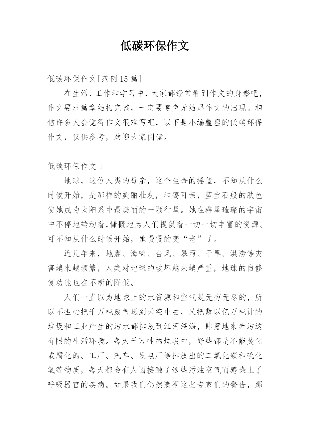 低碳环保作文低碳环保作文[范例15篇]在生活、工作和学习中,大家都经常看到作文的身影吧,作文要求篇章结构完整,一定要避免无结尾作文的出现。相信许多人会觉得作文很难写吧,以下是小编整理的低碳环保作文,仅供参考,欢迎大家阅读。低碳环保作文1地球,这位人类的母亲,这个生命的摇篮,不知从什么时候开始,是那样的美丽壮观,和蔼可亲,蓝宝石般的肤色使她成为太阳系中最美丽的一颗行星。她在群星璀璨的宇宙中不停地转动着,慷慨地为人们提供着一切一切丰富的资源。可不知从什么时候开始,她慢慢的变“老”了。近几年来,地震、海啸、台风