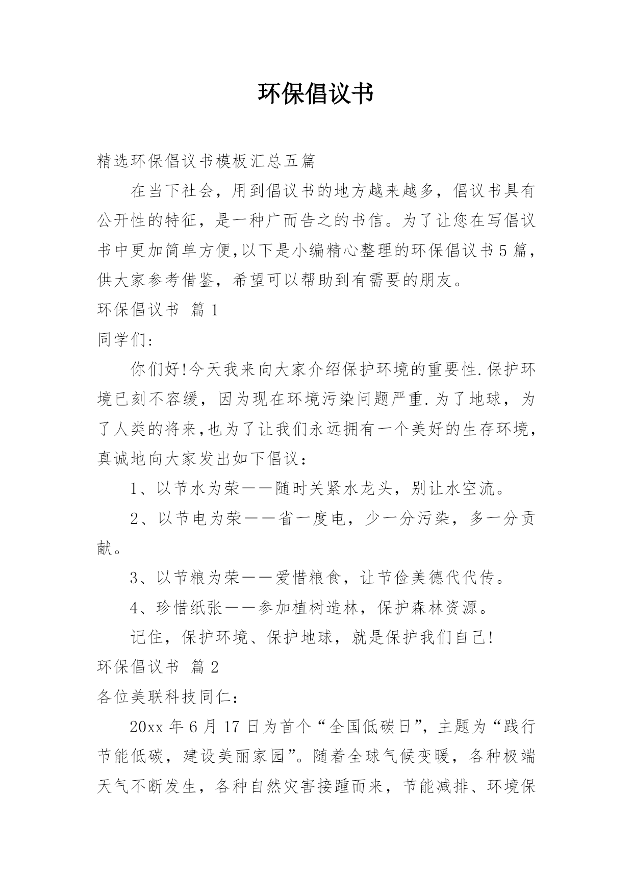 环保倡议书精选环保倡议书模板汇总五篇在当下社会,用到倡议书的地方越来越多,倡议书具有公开性的特征,是一种广而告之的书信。为了让您在写倡议书中更加简单方便,以下是小编精心整理的环保倡议书5篇,供大家参考借鉴,希望可以帮助到有需要的朋友。环保倡议书篇1同学们:你们好!今天我来向大家介绍保护环境的重要性.保护环境已刻不容缓,因为现在环境污染问题严重.为了地球,为了人类的将来,也为了让我们永远拥有一个美好的生存环境,真诚地向大家发出如下倡议:1、以节水为荣――随时关紧水龙头,别让水空流。2、以节电为荣――省一度电