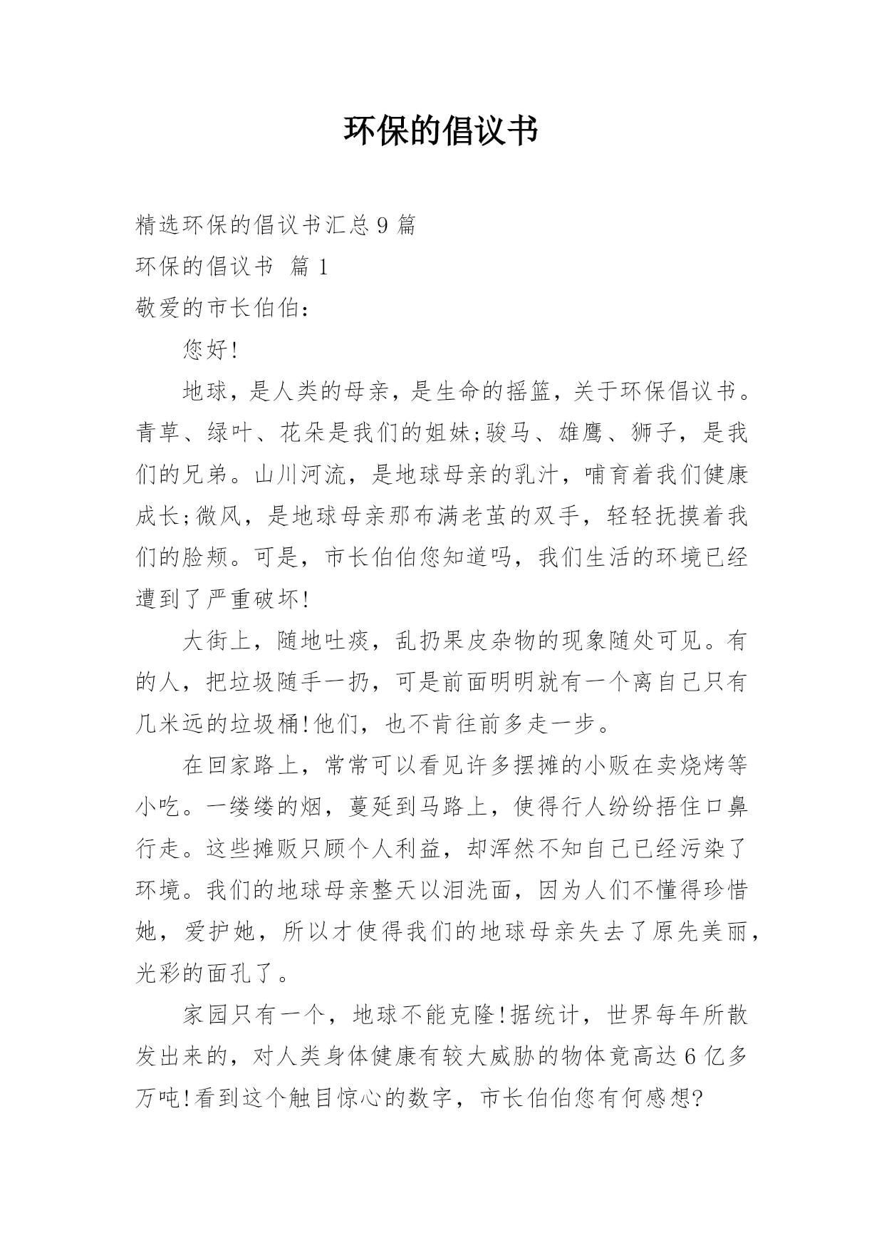 环保的倡议书精选环保的倡议书汇总9篇环保的倡议书篇1敬爱的市长伯伯:您好!地球,是人类的母亲,是生命的摇篮,关于环保倡议书。青草、绿叶、花朵是我们的姐妹;骏马、雄鹰、狮子,是我们的兄弟。山川河流,是地球母亲的乳汁,哺育着我们健康成长;微风,是地球母亲那布满老茧的双手,轻轻抚摸着我们的脸颊。可是,市长伯伯您知道吗,我们生活的环境已经遭到了严重破坏!大街上,随地吐痰,乱扔果皮杂物的现象随处可见。有的人,把垃圾随手一扔,可是前面明明就有一个离自己只有几米远的垃圾桶!他们,也不肯往前多走一步。在回家路上,常常可以