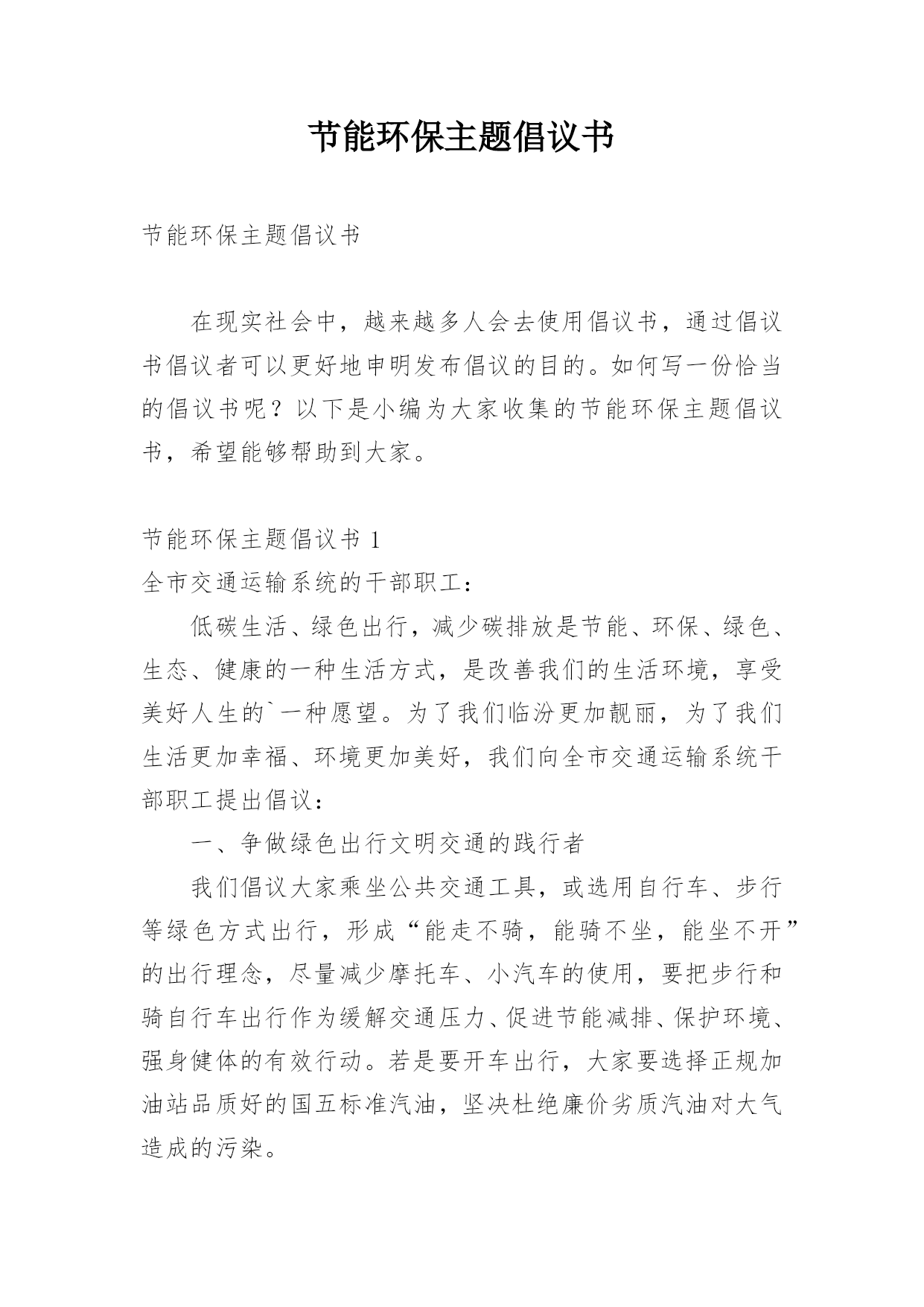 节能环保主题倡议书节能环保主题倡议书在现实社会中,越来越多人会去使用倡议书,通过倡议书倡议者可以更好地申明发布倡议的目的。如何写一份恰当的倡议书呢?以下是小编为大家收集的节能环保主题倡议书,希望能够帮助到大家。节能环保主题倡议书1全市交通运输系统的干部职工:低碳生活、绿色出行,减少碳排放是节能、环保、绿色、生态、健康的一种生活方式,是改善我们的生活环境,享受美好人生的`一种愿望。为了我们临汾更加靓丽,为了我们生活更加幸福、环境更加美好,我们向全市交通运输系统干部职工提出倡议:一、争做绿色出行文明交通的践行