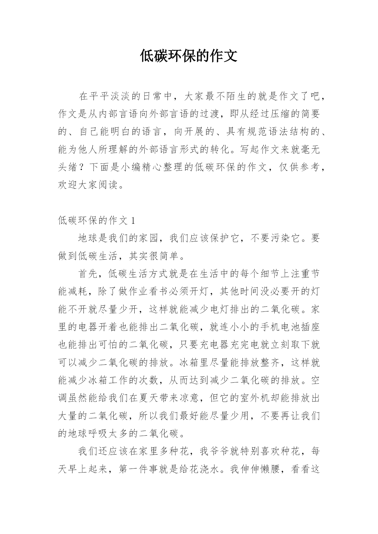 低碳环保的作文在平平淡淡的日常中,大家最不陌生的就是作文了吧,作文是从内部言语向外部言语的过渡,即从经过压缩的简要的、自己能明白的语言,向开展的、具有规范语法结构的、能为他人所理解的外部语言形式的转化。写起作文来就毫无头绪?下面是小编精心整理的低碳环保的作文,仅供参考,欢迎大家阅读。低碳环保的作文1地球是我们的家园,我们应该保护它,不要污染它。要做到低碳生活,其实很简单。首先,低碳生活方式就是在生活中的每个细节上注重节能减耗,除了做作业看书必须开灯,其他时间没必要开的灯能不开就尽量少开,这样就能减少电灯排