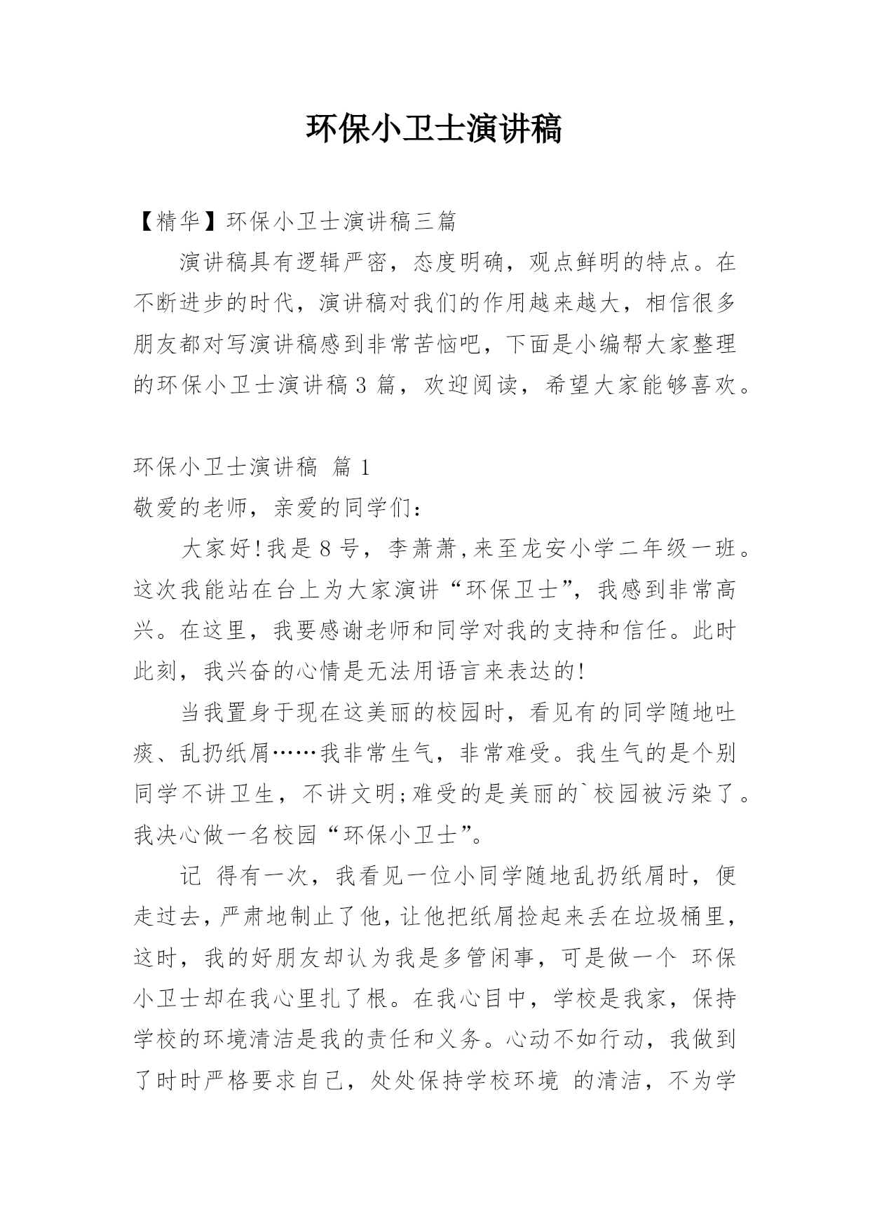环保小卫士演讲稿【精华】环保小卫士演讲稿三篇演讲稿具有逻辑严密,态度明确,观点鲜明的特点。在不断进步的时代,演讲稿对我们的作用越来越大,相信很多朋友都对写演讲稿感到非常苦恼吧,下面是小编帮大家整理的环保小卫士演讲稿3篇,欢迎阅读,希望大家能够喜欢。环保小卫士演讲稿篇1敬爱的老师,亲爱的同学们:大家好!我是8号,李萧萧,来至龙安小学二年级一班。这次我能站在台上为大家演讲“环保卫士”,我感到非常高兴。在这里,我要感谢老师和同学对我的支持和信任。此时此刻,我兴奋的心情是无法用语言来表达的!当我置身于现在这美丽的