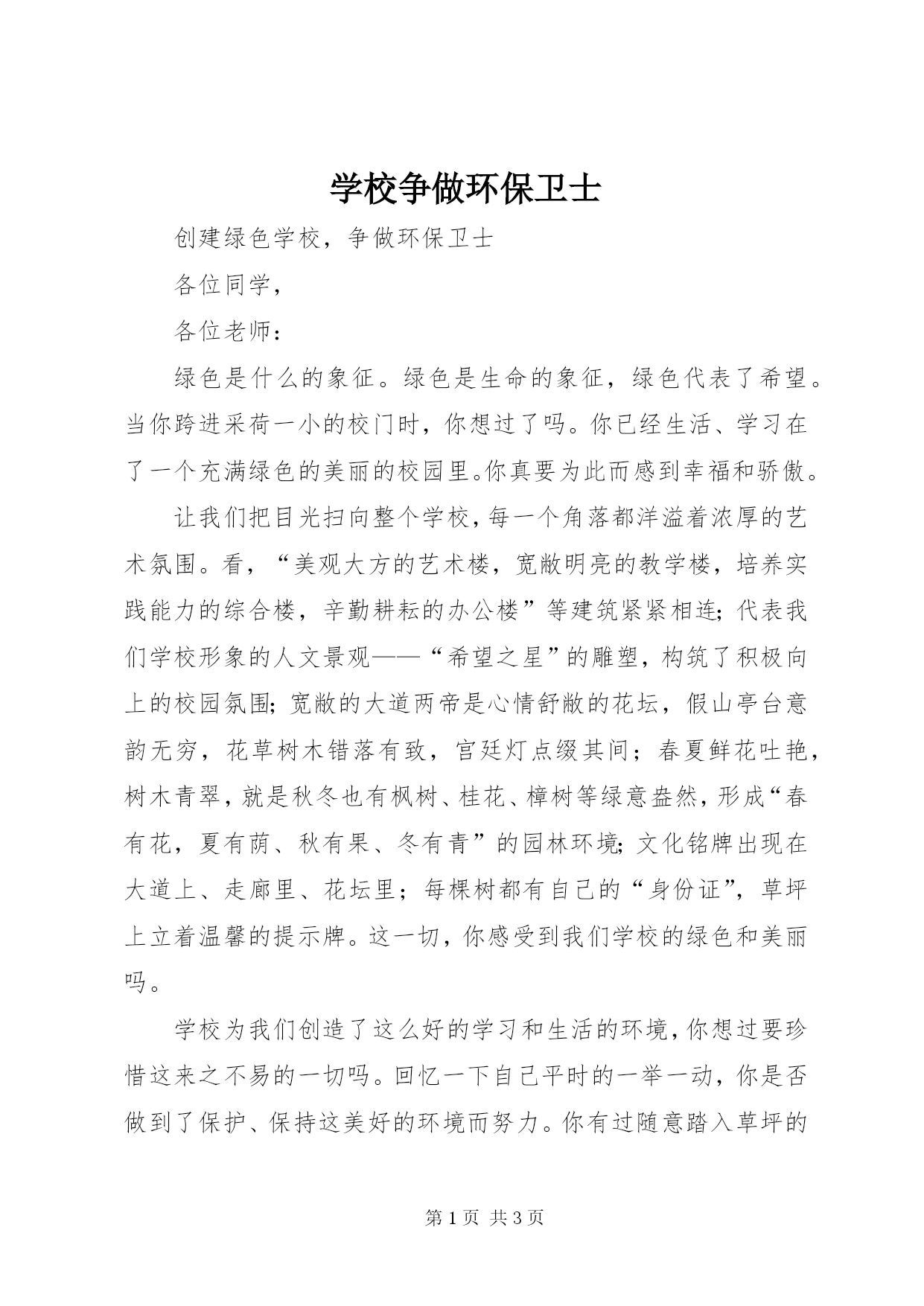 第PAGE\*Arabic\*MERGEFORMAT3页共NUMPAGES\*MERGEFORMAT3页学校争做环保卫士创建绿色学校,争做环保卫士各位同学,各位老师:绿色是什么的象征。绿色是生命的象征,绿色代表了希望。当你跨进采荷一小的校门时,你想过了吗。你已经生活、学习在了一个充满绿色的美丽的校园里。你真要为此而感到幸福和骄傲。让我们把目光扫向整个学校,每一个角落都洋溢着浓厚的艺术氛围。看,“美观大方的艺术楼,宽敝明亮的教学楼,培养实践能力的综合楼,辛勤耕耘的办公楼”等建筑紧紧相连;代表我们
