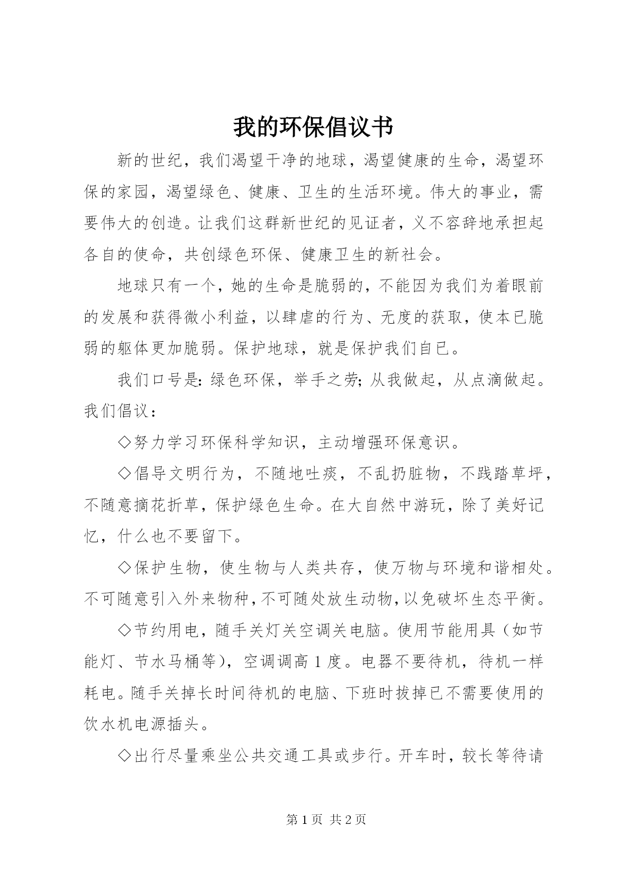 第PAGE\*Arabic\*MERGEFORMAT2页共NUMPAGES\*MERGEFORMAT2页我的环保倡议书新的世纪,我们渴望干净的地球,渴望健康的生命,渴望环保的家园,渴望绿色、健康、卫生的生活环境。伟大的事业,需要伟大的创造。让我们这群新世纪的见证者,义不容辞地承担起各自的使命,共创绿色环保、健康卫生的新社会。地球只有一个,她的生命是脆弱的,不能因为我们为着眼前的发展和获得微小利益,以肆虐的行为、无度的获取,使本已脆弱的躯体更加脆弱。保护地球,就是保护我们自已。我们口号是:绿色环