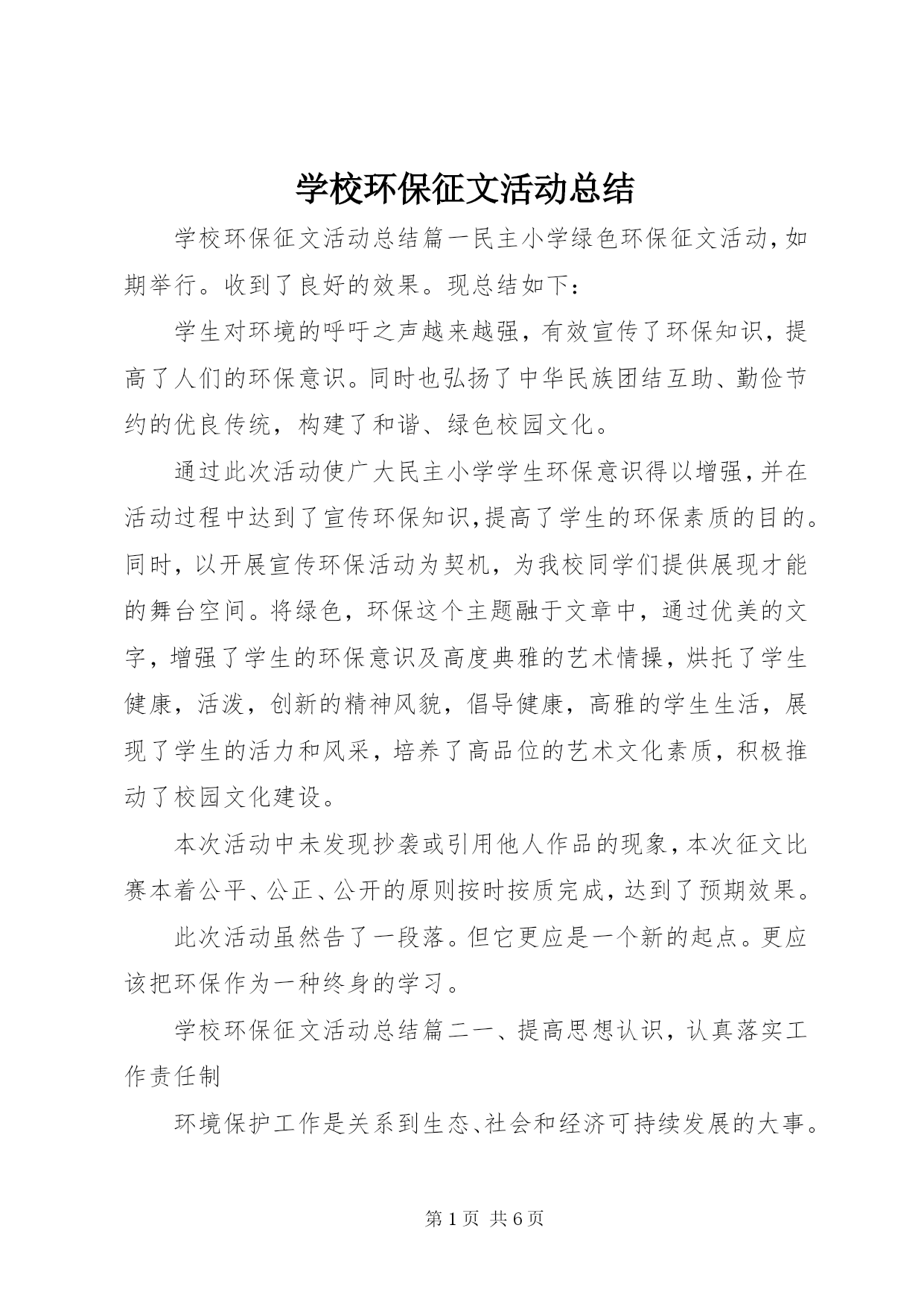 第PAGE\*Arabic\*MERGEFORMAT6页共NUMPAGES\*MERGEFORMAT6页学校环保征文活动总结学校环保征文活动总结篇一民主小学绿色环保征文活动,如期举行。收到了良好的效果。现总结如下:学生对环境的呼吁之声越来越强,有效宣传了环保知识,提高了人们的环保意识。同时也弘扬了中华民族团结互助、勤俭节约的优良传统,构建了和谐、绿色校园文化。通过此次活动使广大民主小学学生环保意识得以增强,并在活动过程中达到了宣传环保知识,提高了学生的环保素质的目的。同时,以开展宣传环保活动为