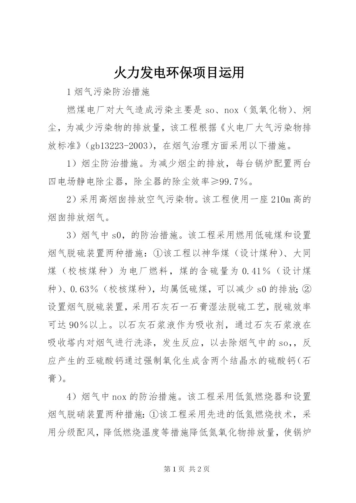 第PAGE\*Arabic\*MERGEFORMAT2页共NUMPAGES\*MERGEFORMAT2页火力发电环保项目运用1烟气污染防治措施燃煤电厂对大气造成污染主要是so、nox(氮氧化物)、炯尘,为减少污染物的排放量,该工程根据《火电厂大气污染物排放标准》(gb13223-2003),在烟气治理方面采用以下措施。1)烟尘防治措施。为减少烟尘的排放,每台锅炉配置两台四电场静电除尘器,除尘器的除尘效率≥99.7%。2)采用高烟囱排放空气污染物。该工程使用一座210m高的烟囱排放烟气。3)烟气