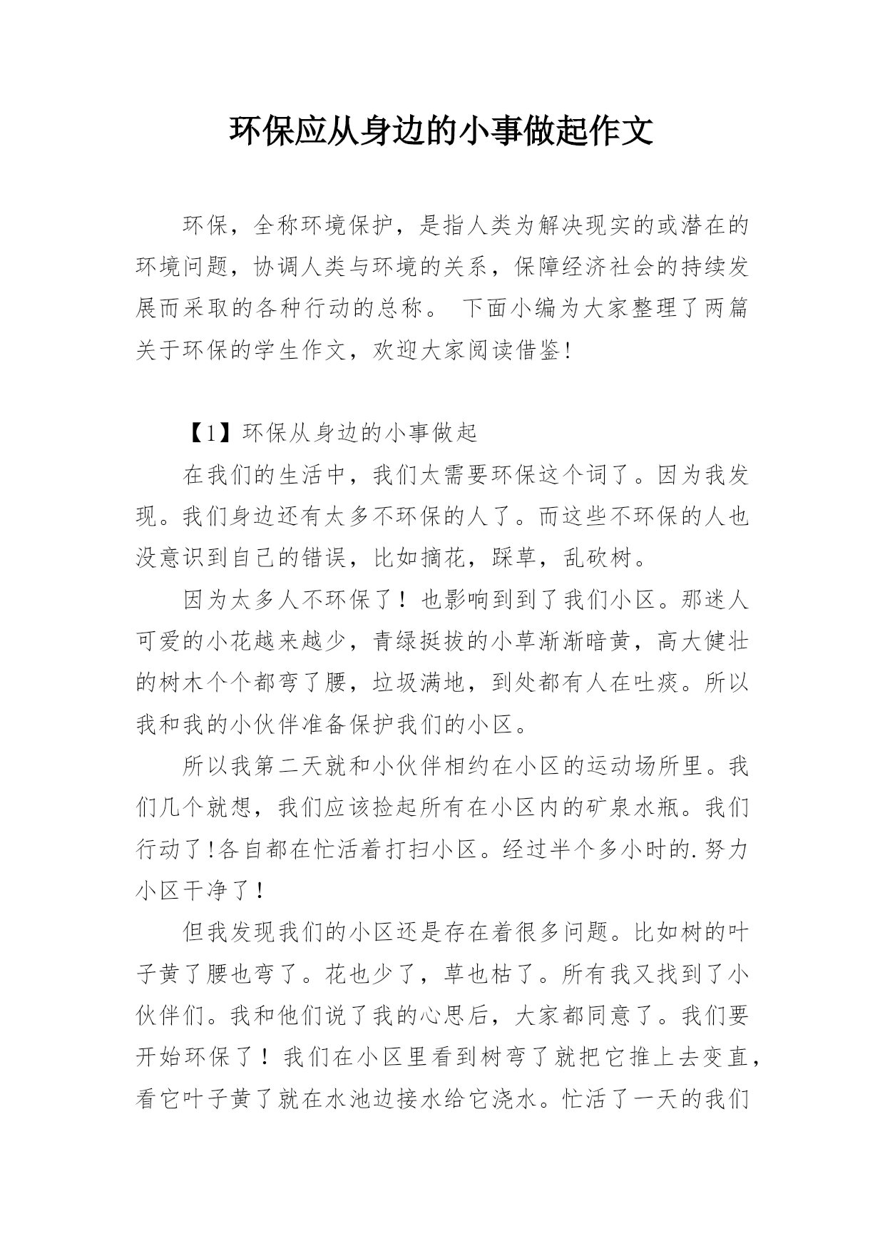 环保应从身边的小事做起作文环保,全称环境保护,是指人类为解决现实的或潜在的环境问题,协调人类与环境的关系,保障经济社会的持续发展而采取的各种行动的总称。下面小编为大家整理了两篇关于环保的学生作文,欢迎大家阅读借鉴!【1】环保从身边的小事做起在我们的生活中,我们太需要环保这个词了。因为我发现。我们身边还有太多不环保的人了。而这些不环保的人也没意识到自己的错误,比如摘花,踩草,乱砍树。因为太多人不环保了!也影响到到了我们小区。那迷人可爱的小花越来越少,青绿挺拔的小草渐渐暗黄,高大健壮的树木个个都弯了腰,垃圾满