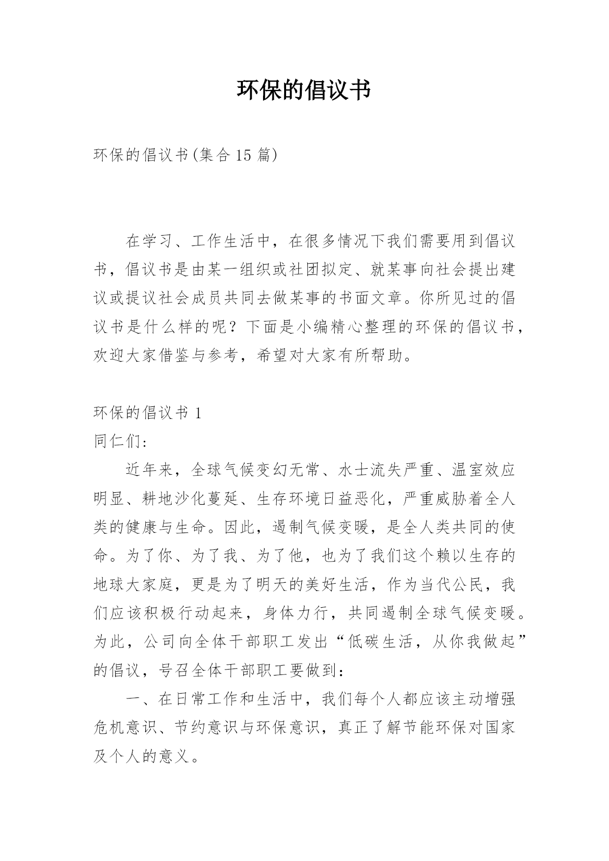 环保的倡议书环保的倡议书(集合15篇)在学习、工作生活中,在很多情况下我们需要用到倡议书,倡议书是由某一组织或社团拟定、就某事向社会提出建议或提议社会成员共同去做某事的书面文章。你所见过的倡议书是什么样的呢?下面是小编精心整理的环保的倡议书,欢迎大家借鉴与参考,希望对大家有所帮助。环保的倡议书1同仁们:近年来,全球气候变幻无常、水士流失严重、温室效应明显、耕地沙化蔓延、生存环境日益恶化,严重威胁着全人类的健康与生命。因此,遏制气候变暖,是全人类共同的使命。为了你、为了我、为了他,也为了我们这个赖以生存的地