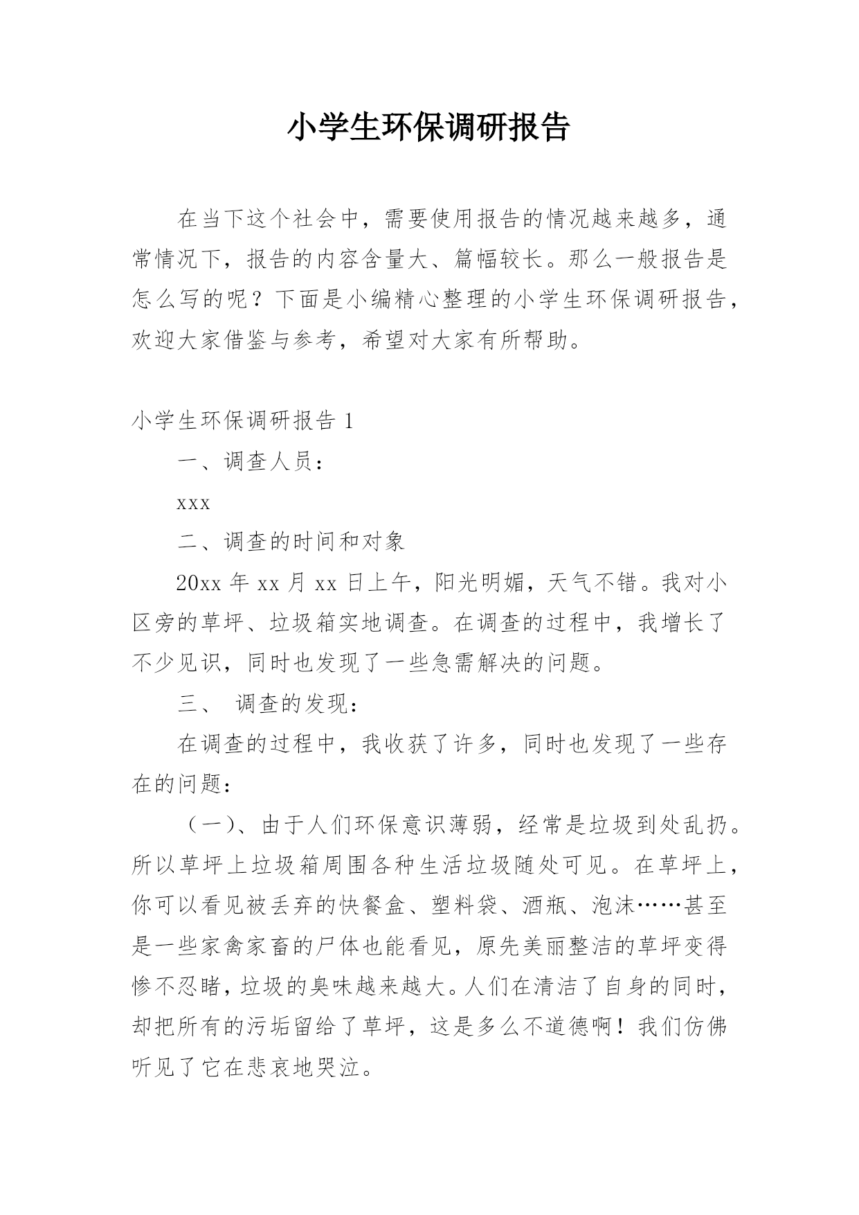 小学生环保调研报告在当下这个社会中,需要使用报告的情况越来越多,通常情况下,报告的内容含量大、篇幅较长。那么一般报告是怎么写的呢?下面是小编精心整理的小学生环保调研报告,欢迎大家借鉴与参考,希望对大家有所帮助。小学生环保调研报告1一、调查人员:xxx二、调查的时间和对象20xx年xx月xx日上午,阳光明媚,天气不错。我对小区旁的草坪、垃圾箱实地调查。在调查的过程中,我增长了不少见识,同时也发现了一些急需解决的问题。三、调查的发现:在调查的过程中,我收获了许多,同时也发现了一些存在的问题:(一)、由于人们环