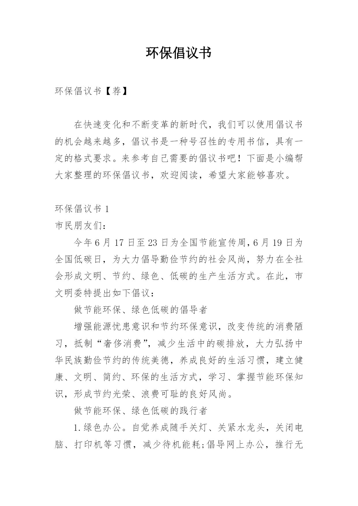环保倡议书环保倡议书【荐】在快速变化和不断变革的新时代,我们可以使用倡议书的机会越来越多,倡议书是一种号召性的专用书信,具有一定的格式要求。来参考自己需要的倡议书吧!下面是小编帮大家整理的环保倡议书,欢迎阅读,希望大家能够喜欢。环保倡议书1市民朋友们:今年6月17日至23日为全国节能宣传周,6月19日为全国低碳日,为大力倡导勤俭节约的社会风尚,努力在全社会形成文明、节约、绿色、低碳的生产生活方式。在此,市文明委特提出如下倡议:做节能环保、绿色低碳的倡导者增强能源忧患意识和节约环保意识,改变传统的消费陋习,