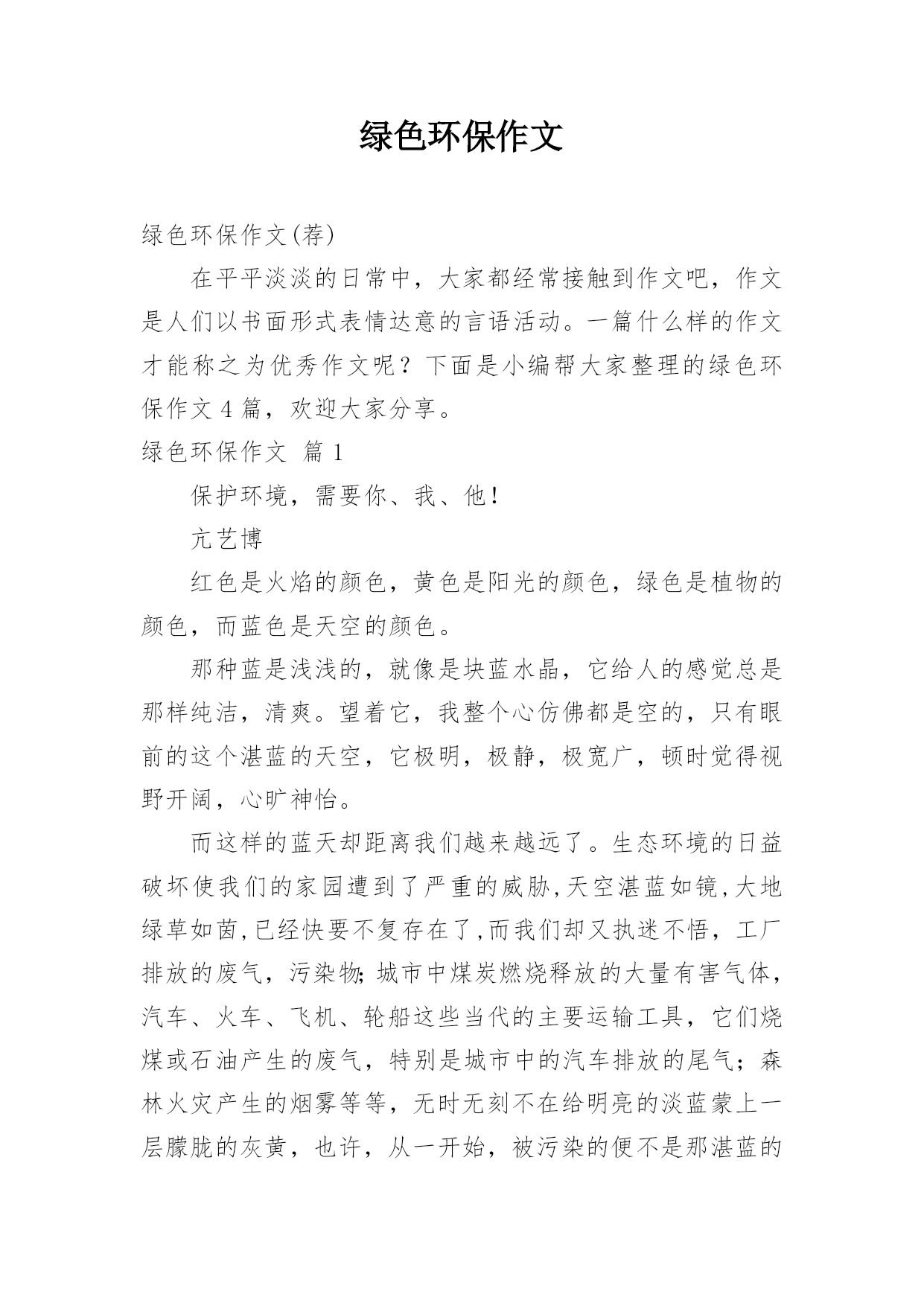 绿色环保作文绿色环保作文(荐)在平平淡淡的日常中,大家都经常接触到作文吧,作文是人们以书面形式表情达意的言语活动。一篇什么样的作文才能称之为优秀作文呢?下面是小编帮大家整理的绿色环保作文4篇,欢迎大家分享。绿色环保作文篇1保护环境,需要你、我、他!亢艺博红色是火焰的颜色,黄色是阳光的颜色,绿色是植物的颜色,而蓝色是天空的颜色。那种蓝是浅浅的,就像是块蓝水晶,它给人的感觉总是那样纯洁,清爽。望着它,我整个心仿佛都是空的,只有眼前的这个湛蓝的天空,它极明,极静,极宽广,顿时觉得视野开阔,心旷神怡。而这样的蓝天