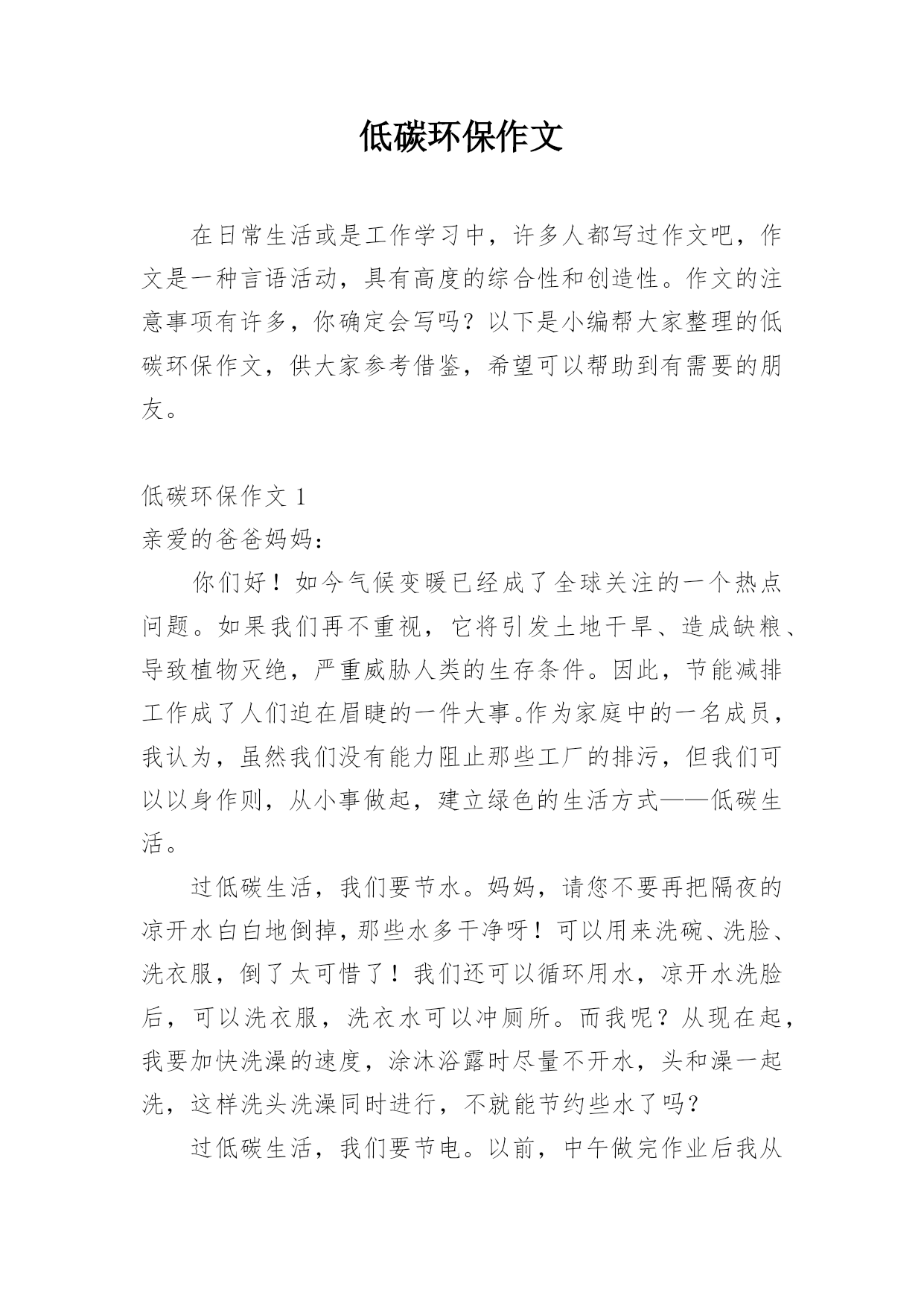 低碳环保作文在日常生活或是工作学习中,许多人都写过作文吧,作文是一种言语活动,具有高度的综合性和创造性。作文的注意事项有许多,你确定会写吗?以下是小编帮大家整理的低碳环保作文,供大家参考借鉴,希望可以帮助到有需要的朋友。低碳环保作文1亲爱的爸爸妈妈:你们好!如今气候变暖已经成了全球关注的一个热点问题。如果我们再不重视,它将引发土地干旱、造成缺粮、导致植物灭绝,严重威胁人类的生存条件。因此,节能减排工作成了人们迫在眉睫的一件大事。作为家庭中的一名成员,我认为,虽然我们没有能力阻止那些工厂的排污,但我们可以以
