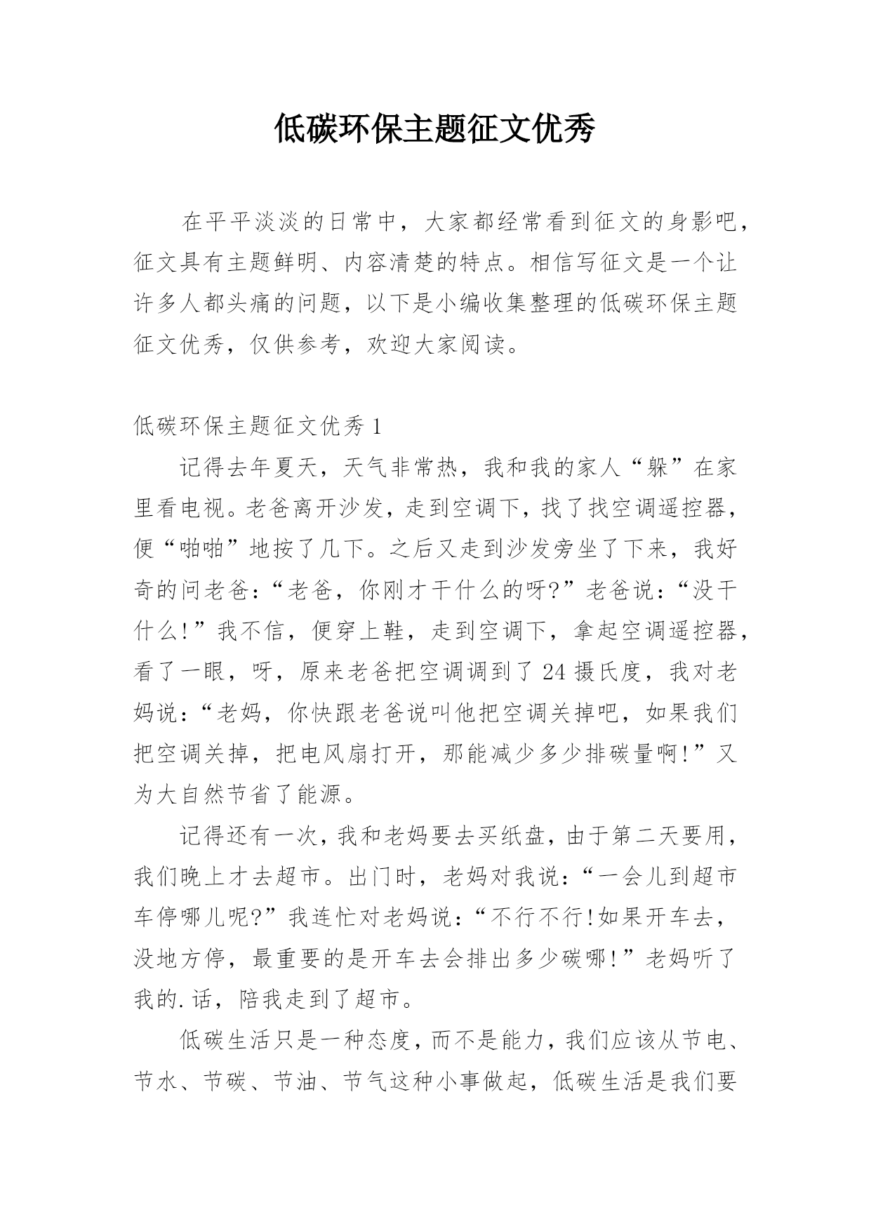 低碳环保主题征文优秀在平平淡淡的日常中,大家都经常看到征文的身影吧,征文具有主题鲜明、内容清楚的特点。相信写征文是一个让许多人都头痛的问题,以下是小编收集整理的低碳环保主题征文优秀,仅供参考,欢迎大家阅读。低碳环保主题征文优秀1记得去年夏天,天气非常热,我和我的家人“躲”在家里看电视。老爸离开沙发,走到空调下,找了找空调遥控器,便“啪啪”地按了几下。之后又走到沙发旁坐了下来,我好奇的问老爸:“老爸,你刚才干什么的呀?”老爸说:“没干什么!”我不信,便穿上鞋,走到空调下,拿起空调遥控器,看了一眼,呀,原来老