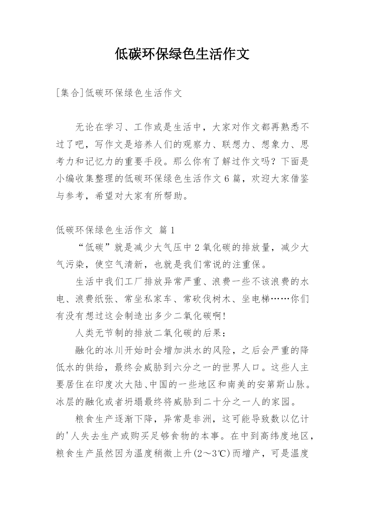 低碳环保绿色生活作文[集合]低碳环保绿色生活作文无论在学习、工作或是生活中,大家对作文都再熟悉不过了吧,写作文是培养人们的观察力、联想力、想象力、思考力和记忆力的重要手段。那么你有了解过作文吗?下面是小编收集整理的低碳环保绿色生活作文6篇,欢迎大家借鉴与参考,希望对大家有所帮助。低碳环保绿色生活作文篇1“低碳”就是减少大气压中2氧化碳的排放量,减少大气污染,使空气清新,也就是我们常说的注重保。生活中我们工厂排放异常严重、浪费一些不该浪费的水电、浪费纸张、常坐私家车、常砍伐树木、坐电梯……你们有没有想过这会