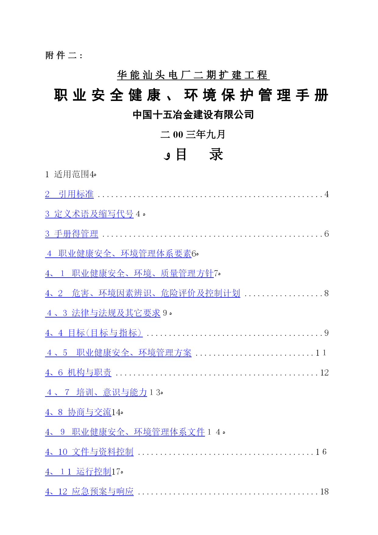 附件二:华能汕头电厂二期扩建工程职业安全健康、环境保护管理手册中国十五冶金建设有限公司二00三年九月ﻮ目录TOC\o"1-3"\h\zHYPERLINK\l"_Toc50696493"1适用范围ﻩPAGEREF_Toc50696493\h4HYPERLINK\l"_Toc50696494"2引用标准PAGEREF_Toc50696494\h4HYPERLINK\l"_Toc50696495"3定义术语及缩写代号ﻩPAGEREF_Toc50696495\h4HYP