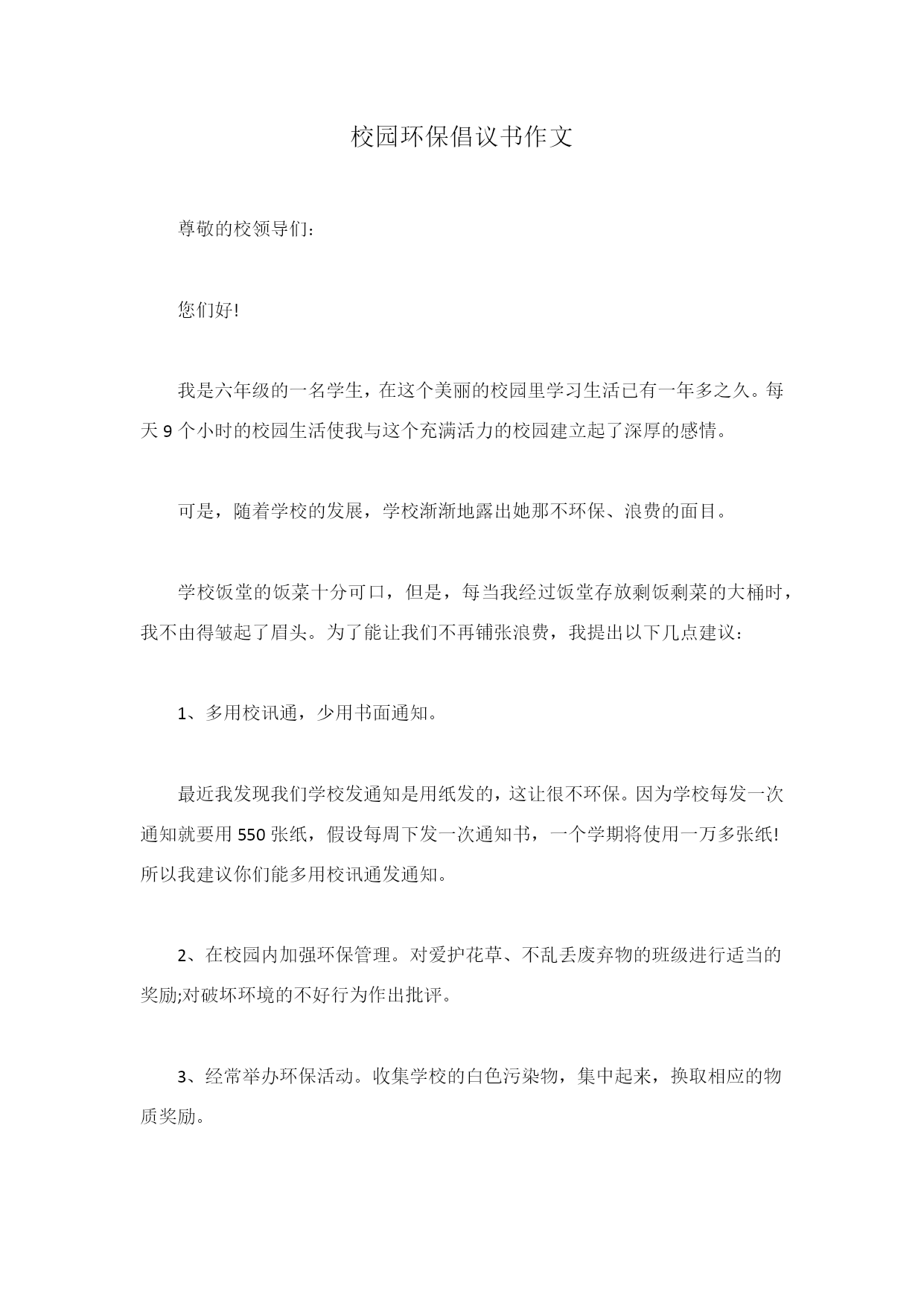 校园环保倡议书作文尊敬的校领导们:您们好!我是六年级的一名学生,在这个美丽的校园里学习生活已有一年多之久。每天9个小时的校园生活使我与这个充满活力的校园建立起了深厚的感情。可是,随着学校的发展,学校渐渐地露出她那不环保、浪费的面目。学校饭堂的饭菜十分可口,但是,每当我经过饭堂存放剩饭剩菜的大桶时,我不由得皱起了眉头。为了能让我们不再铺张浪费,我提出以下几点建议:1、多用校讯通,少用书面通知。最近我发现我们学校发通知是用纸发的,这让很不环保。因为学校每发一次通知就要用550张纸,假设每周下发一次通知书,一个