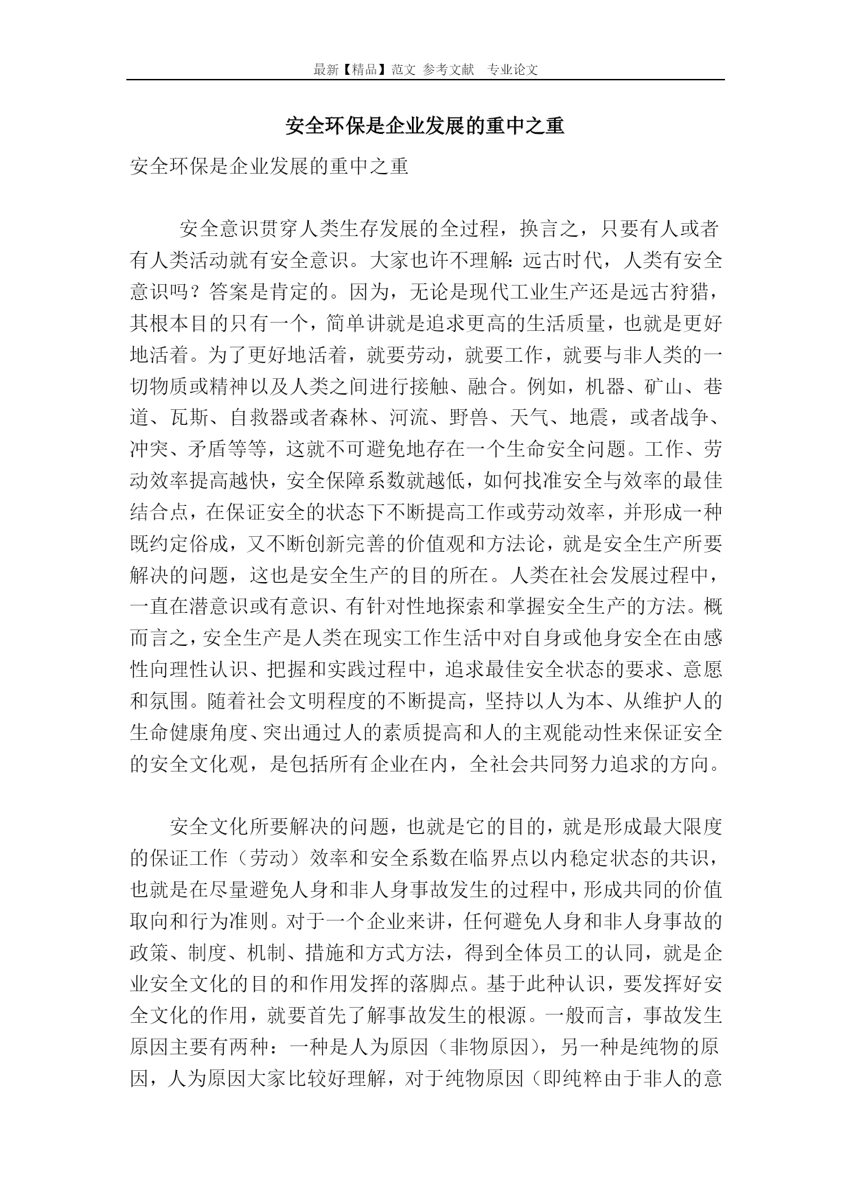 最新【精品】范文参考文献专业论文安全环保是企业发展的重中之重安全环保是企业发展的重中之重安全意识贯穿人类生存发展的全过程,换言之,只要有人或者有人类活动就有安全意识。大家也许不理解:远古时代,人类有安全意识吗?答案是肯定的。因为,无论是现代工业生产还是远古狩猎,其根本目的只有一个,简单讲就是追求更高的生活质量,也就是更好地活着。为了更好地活着,就要劳动,就要工作,就要与非人类的一切物质或精神以及人类之间进行接触、融合。例如,机器、矿山、巷道、瓦斯、自救器或者森林、河流、野兽、天气、地震,或者战争、冲突、矛
