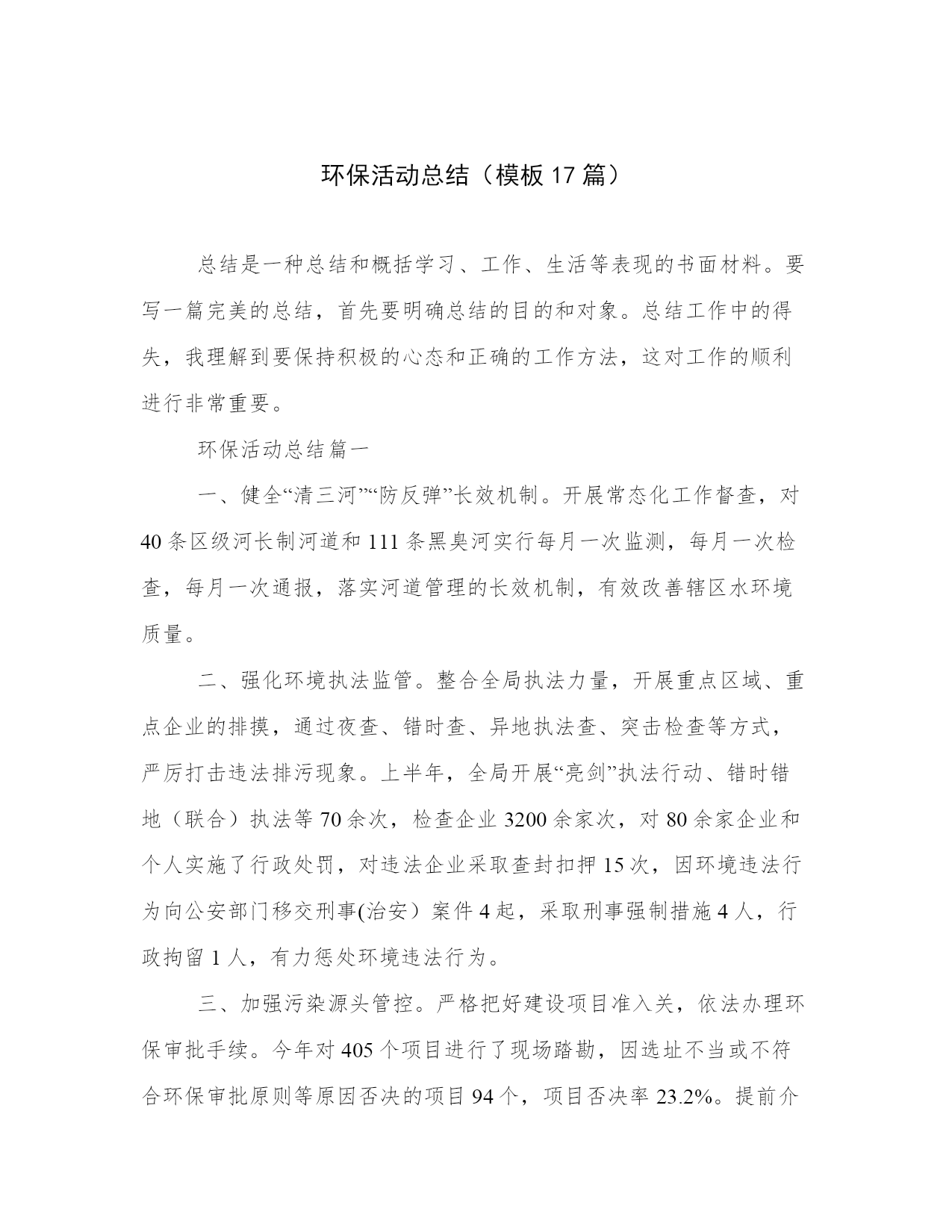 环保活动总结(模板17篇)总结是一种总结和概括学习、工作、生活等表现的书面材料。要写一篇完美的总结,首先要明确总结的目的和对象。总结工作中的得失,我理解到要保持积极的心态和正确的工作方法,这对工作的顺利进行非常重要。环保活动总结篇一一、健全“清三河”“防反弹”长效机制。开展常态化工作督查,对40条区级河长制河道和111条黑臭河实行每月一次监测,每月一次检查,每月一次通报,落实河道管理的长效机制,有效改善辖区水环境质量。二、强化环境执法监管。整合全局执法力量,开展重点区域、重点企业的排摸,通过夜查、错时查、