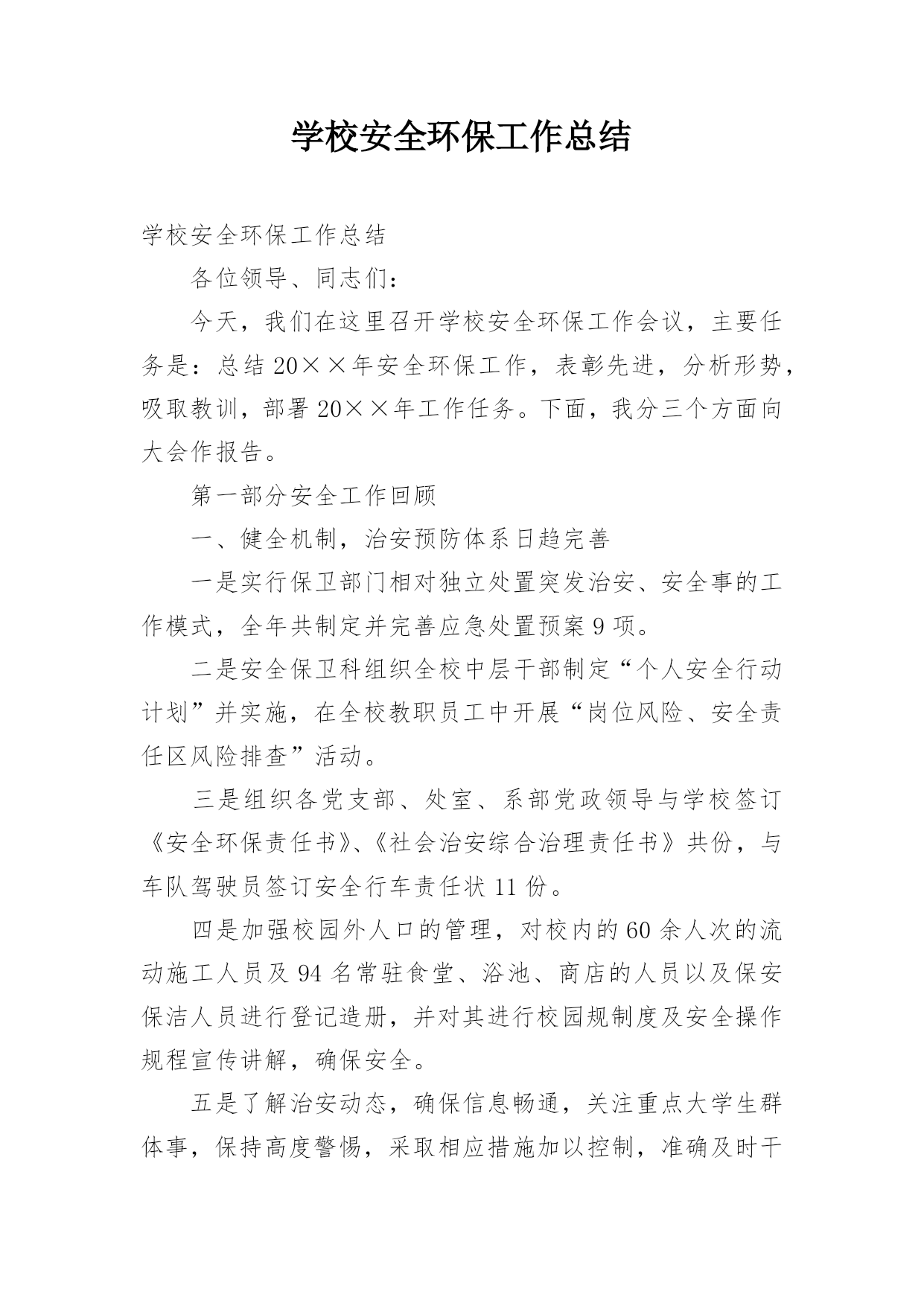 学校安全环保工作总结学校安全环保工作总结各位领导、同志们:今天,我们在这里召开学校安全环保工作会议,主要任务是:总结20××年安全环保工作,表彰先进,分析形势,吸取教训,部署20××年工作任务。下面,我分三个方面向大会作报告。第一部分安全工作回顾一、健全机制,治安预防体系日趋完善一是实行保卫部门相对独立处置突发治安、安全事的工作模式,全年共制定并完善应急处置预案9项。二是安全保卫科组织全校中层干部制定“个人安全行动计划”并实施,在全校教职员工中开展“岗位风险、安全责任区风险排查”活动。三是组织各党支部、处