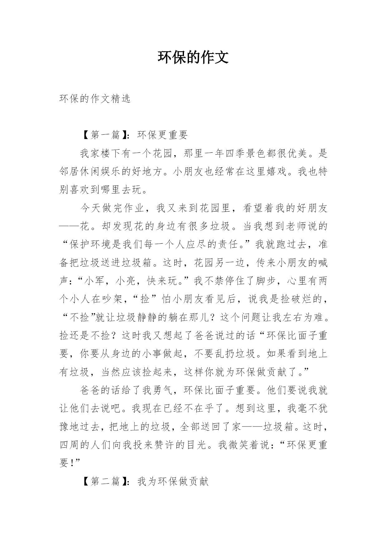 环保的作文环保的作文精选【第一篇】:环保更重要我家楼下有一个花园,那里一年四季景色都很优美。是邻居休闲娱乐的好地方。小朋友也经常在这里嬉戏。我也特别喜欢到哪里去玩。今天做完作业,我又来到花园里,看望着我的好朋友——花。却发现花的身边有很多垃圾。当我想到老师说的“保护环境是我们每一个人应尽的责任。”我就跑过去,准备把垃圾送进垃圾箱。这时,花园另一边,传来小朋友的喊声:“小军,小亮,快来玩。”我不禁停住了脚步,心里有两个小人在吵架,“捡”怕小朋友看见后,说我是捡破烂的,“不捡”就让垃圾静静的躺在那儿?这个问题